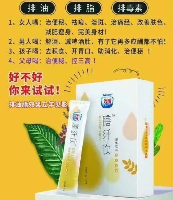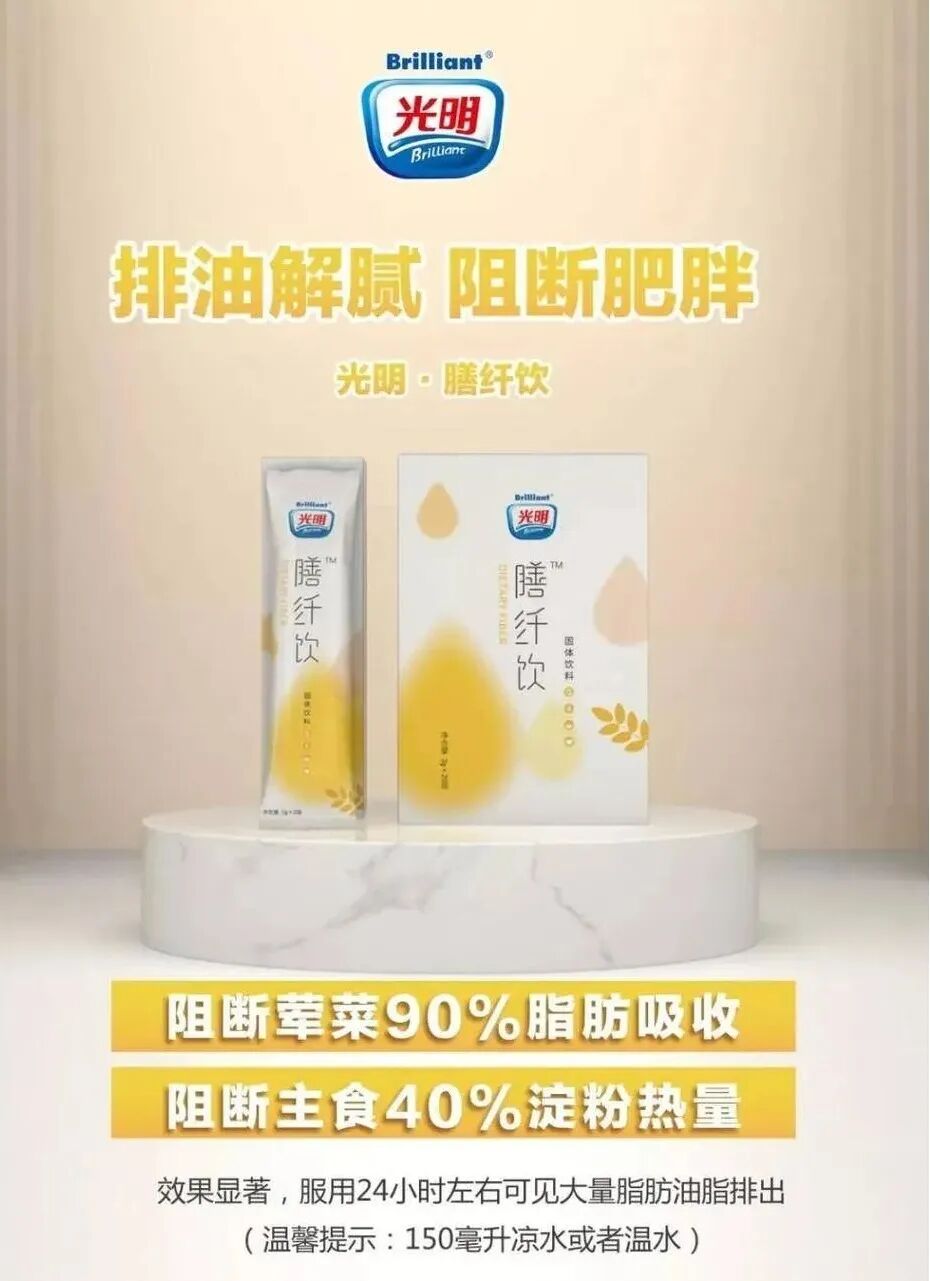 光明膳纤饮是一款固体饮料,经常饮用可以起到排油排毒、减脂瘦身、清理肠道垃圾毒素的效果。在你吃了很多高热量,高脂肪,油腻的食物之后,喝一杯光明膳纤饮可以阻断荤菜90%的脂肪吸收,阻断米饭面食等40%的淀粉吸收,10小时内排出淀粉热量,20小时内排出脂肪油脂,光明膳纤饮双阻双排的功效,让你大餐不后悔,饮食无负担,彻底消灭饮食恐惧症。