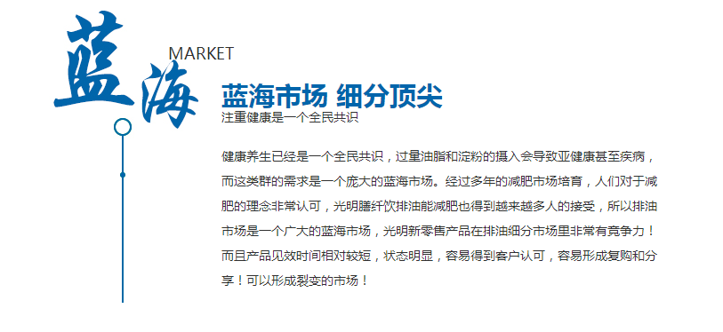 光明膳纤饮是一款食品级的固体饮料,可以阻断大米,面食等主食里面的40%淀粉的吸收,阻断晕菜里面90%的脂肪油脂的吸收,把平日饮食中过多的高热量高脂肪排掉,以油便形式排出来,让肠道选择性吸收营养物质,真正消灭您的饮食恐惧症。