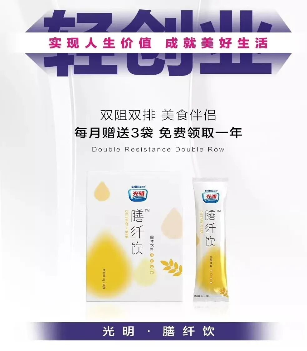 2019年4月,光明携手维密之路联合打造了一款排油减脂的产品,光明膳纤饮。两大品牌,强强联手,光明膳纤饮,拥有全球两大食品专利,两大核心成分和两大营养成分。成分安全无副作用,不节食,防反弹!