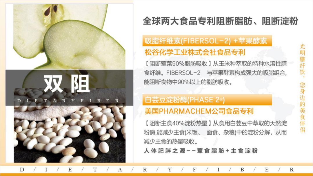 从玉米中萃取的特种水溶性膳食纤维与苹果酵素构成强大的吸脂组合,能阻断食物中90%以上的脂肪吸收。