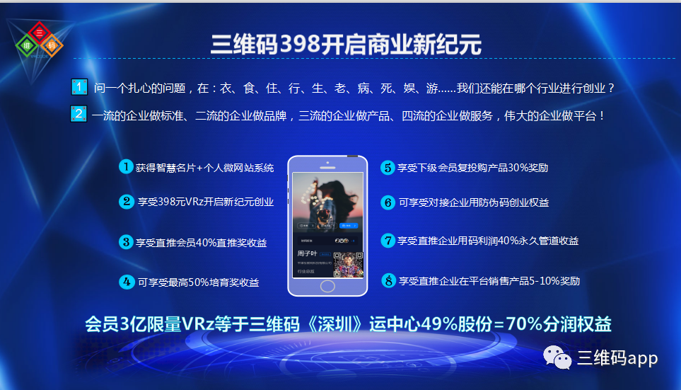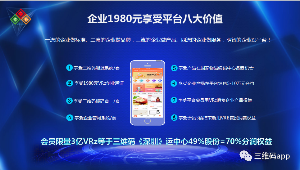 三维码(厦门)网络科技有限公司(简称“三维码科技”),英文 VR Code (Xiamen) Network Technology Co.,Ltd. (简称“VR Code Technology”),成立于2015年11月27日,中国三维码行业标准制定者,总部位于厦门市,是一家拥有国资背景的国家高新技术企业,中国首创的三维码专利技术,致力于解决人与物的在线交互问题。其应用领域涵盖证、章、卡、照、公安应用、智慧旅游、会展、区块链防伪溯源等。公司目前共拥有199项三维码相关知识产权,超过6000万的个人用户,企业用户8万家,多家百强企业选择了我们。