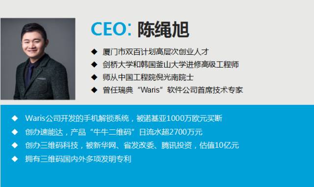 在创业这条康庄大道上从来不缺乏弄潮儿,今天我们就为大家引荐这一位:厦门市引进的第八批双百人才,三维码科技创始人:陈绳旭先生,为大家分享关于他的创业故事: