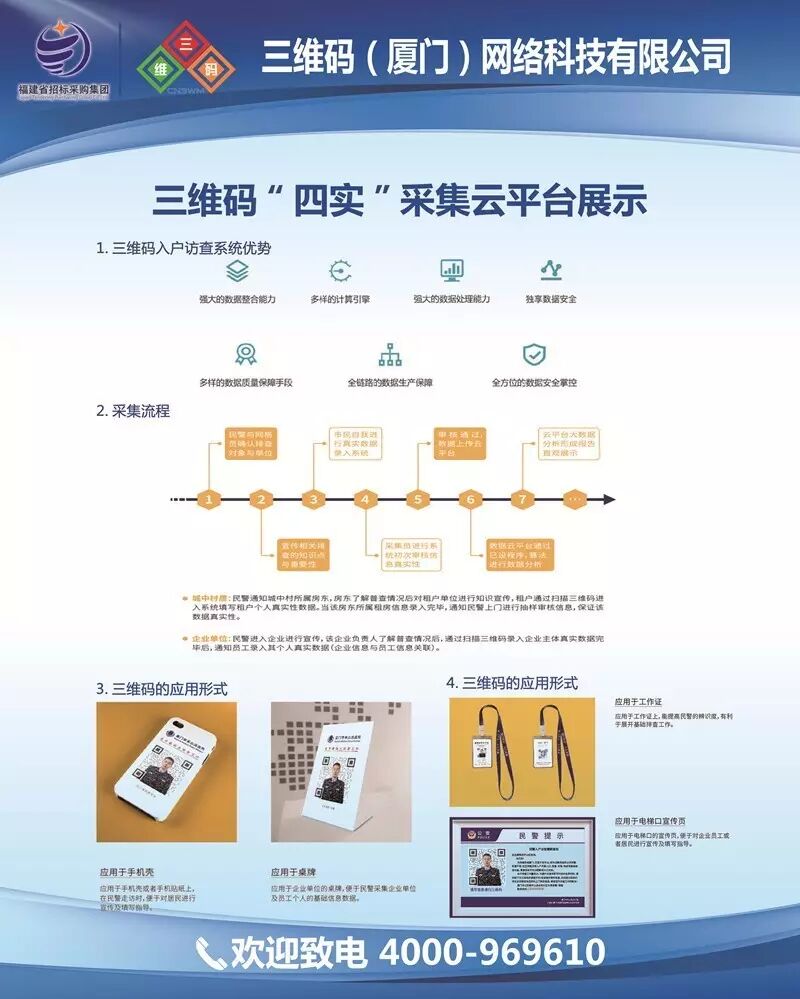 在2017年3月厦门金砖峰会筹备查工作中,三维码携手厦门市公安局参与人口信息采集项目,以城中村建筑居多,外来人口数量庞大的禾山片区为技术试点,研发三维码双向信息采集系统,其中包括:移动端快速采集系统、网上信息填报平台、社区自主采集工具等三维码技术服务。截止1月底,短短10天时间内已采集四实人口信息6万多条,工作效率是传统人工采集的几十倍,受到中国人名公安报及厦门民众的一致好评。