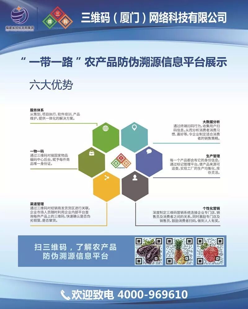 农产品的“前世今生”,扫三维码就能知道。可快速追溯食品、产品的品种、产地、种植环境等关键信息,让消费者放心购买,三维码一带一路农产品防伪溯源平台安心食用。比如,为使用三维码防伪溯源技术的每只红富士苹果粘贴一个三维码防伪标签,这只苹果的生基地名称和注册号,基地VR实景,品种、产量、物流信息等信息就能够通过手机做到全程追溯,国外消费者还可使用中英文翻译一键转换文字,方便农产品的进出口。农产品上的每一张三维码标签背后都有一串独立的数据编号,并上传至国家物品编号中心实行备案,从源头上进行管控。