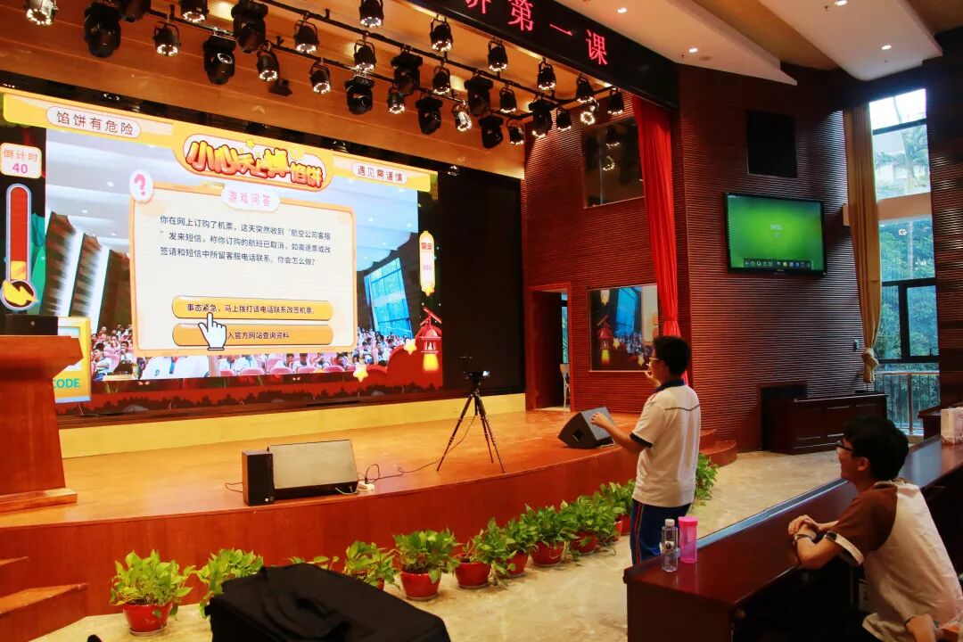 活动现场“小心天上掉馅饼”体感游戏大受欢迎。大屏幕上,各个“黄金馅饼”从天而降,学生们一边切“馅饼”,一边作答突然跳出的防骗测试题,通过人机互动的模式,累计积分兑换礼品,学生们玩得大汗淋漓。我们希望通过趣味体感游戏与防骗问答相结合的互动模式,让他们在参与游戏的过程中提高防骗能力、增强防骗意识。