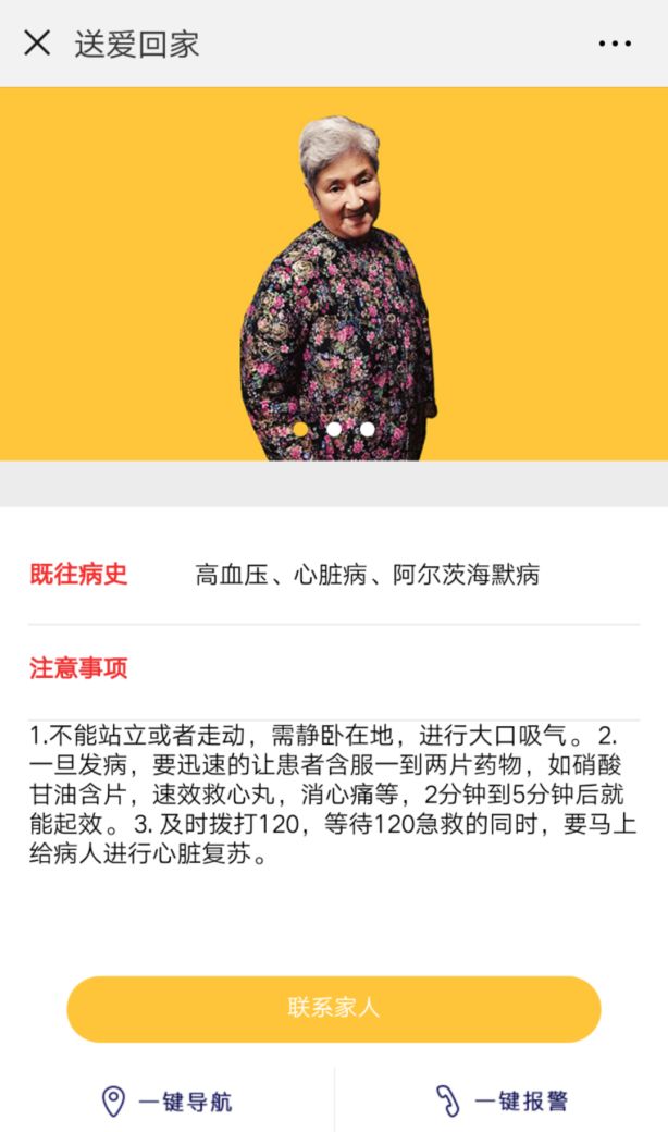 我们希望,当看到佩戴黄手环的老人处于危险或茫然时,可及时得到救助。热心市民群众可扫描手环上的三维码,快速获取信息并联系上家人,还可以进入110人口防走失报警平台,一键报警,并可导航到附近的派出所寻求帮助。同时人性化增加既往病史,让好心人在老人突发病情时也可精准有效地帮助老人减少痛苦或脱离危险。值得一提的是,系统设置了验证通道,作为家属不必担心老人的信息泄露 。