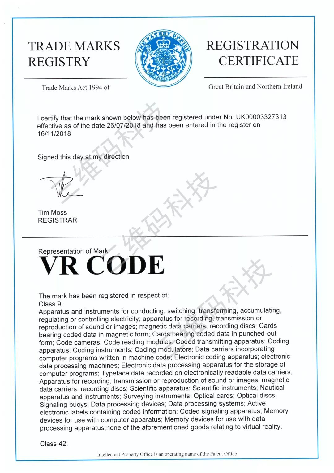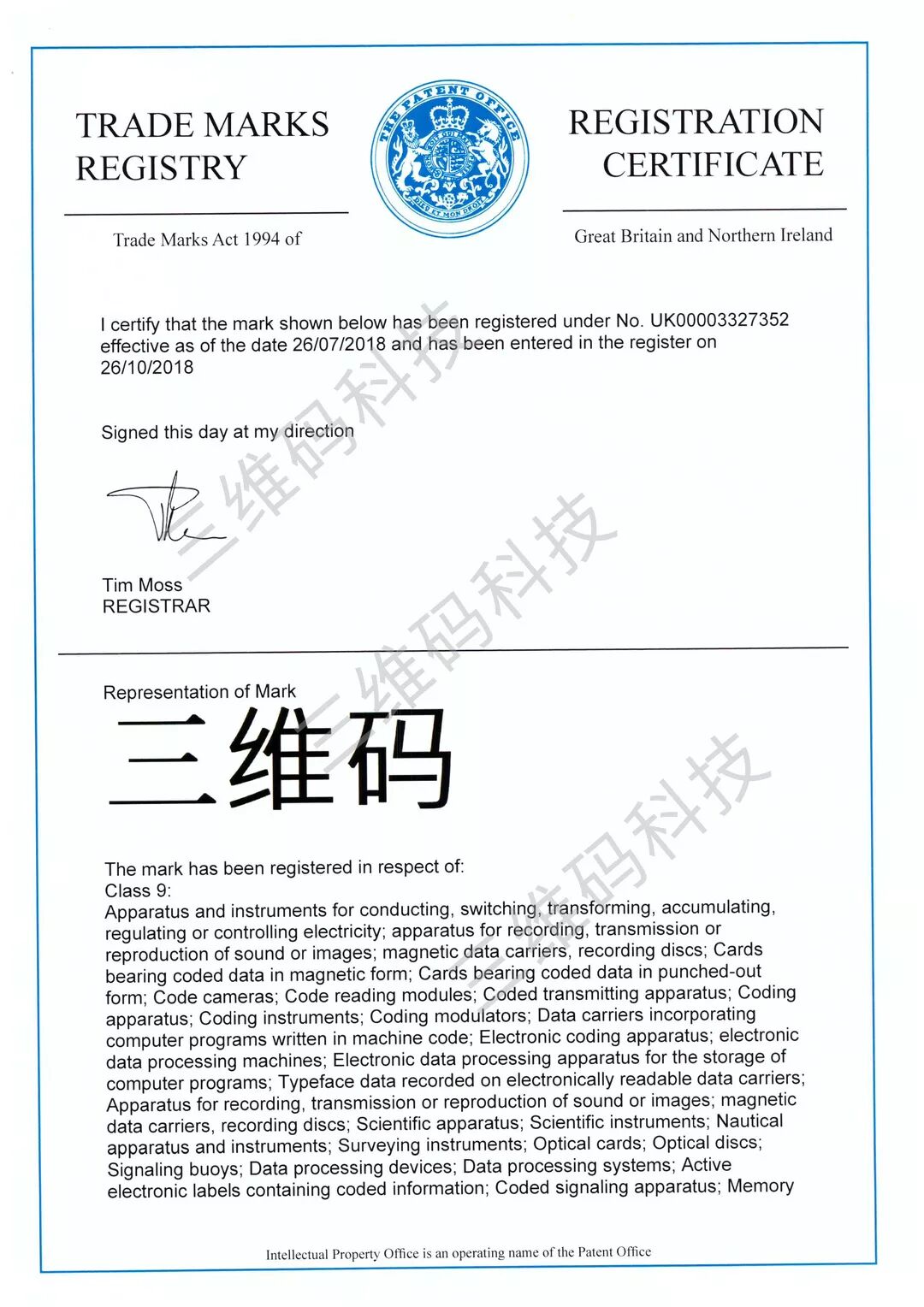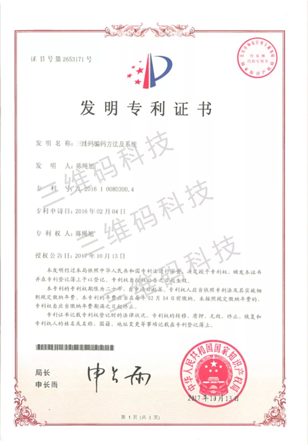 三维码发明专利证书及国内外商标证书