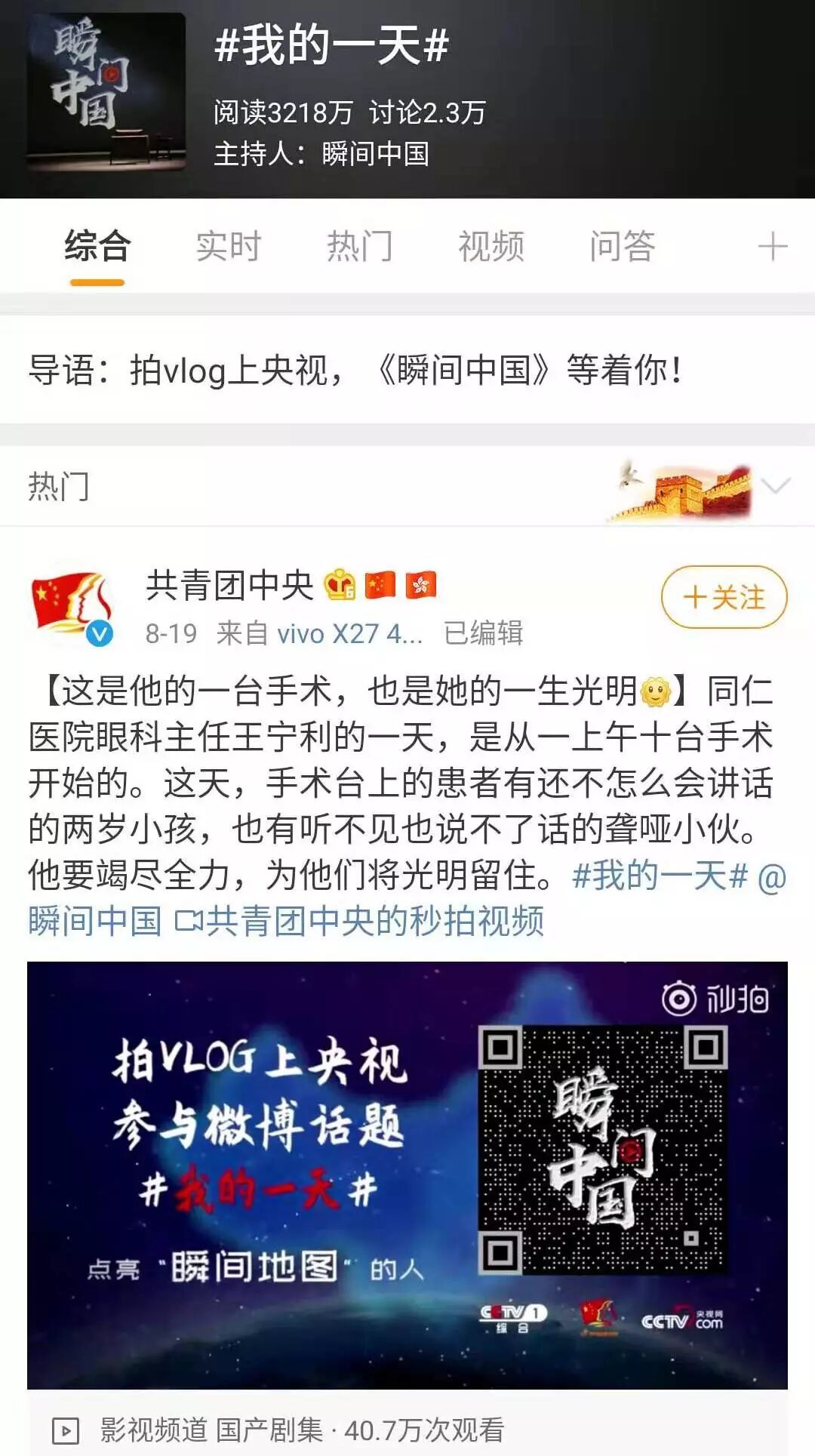 CCTV-1《瞬间中国》发起#我的一天#vlog征集,号召千万网友一起谱写“你的瞬间,我们的中国”美丽篇章,以三维码为入口,互联网活动为载体,聚焦大众共情点,打造全新融媒电视节目,讲述普通中国人砥砺奋斗的幸福故事,实现全媒体发展,构建“信息无处不在、无所不及”的闭环。