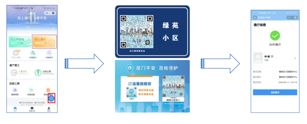 “e鹭安”与新冠肺炎监测溯源系统对接连通,实现个人“平安码”与“健康码”涉疫风险状态的融合叠加,进行“红、黄、绿”三色预警,赋予相应的通行权限,可用于企业、小区、村庄、商户等进行人员通行管理和“涉疫”筛查,实现“持有平安码,通行全厦门”。