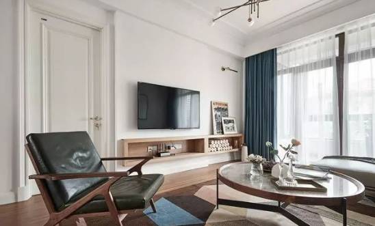 为了衬托出整个空间的轻盈感,客厅的设计重心是往下移的,一张几何图案的地毯,几乎包围了全部家具。