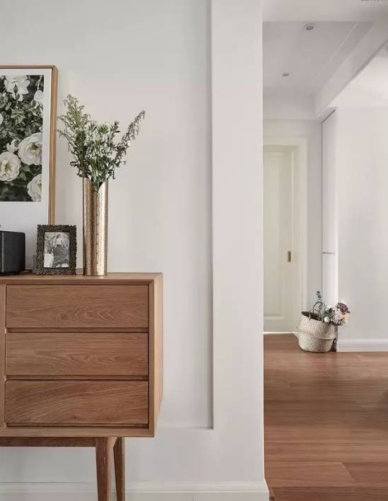 玄关部分通过白色墙面、蓬勃生长的绿植和一个木质的玄关柜,首先奠定了清新自然的视觉基调。