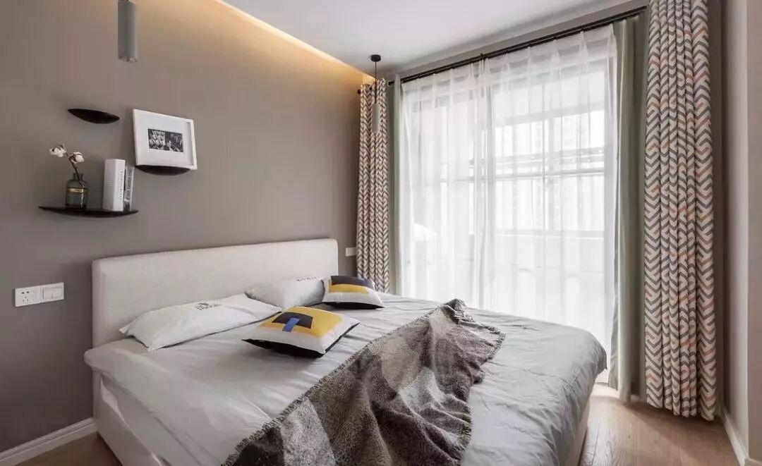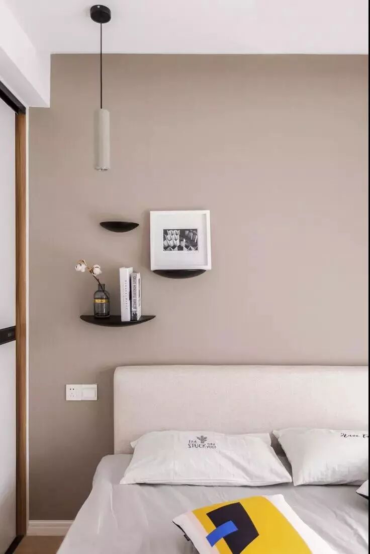 ▲ 墙面设计了错落有致的搁板,代替了传统的床头柜,别致又好看。黄色的抱枕起到了提亮空间的作用。