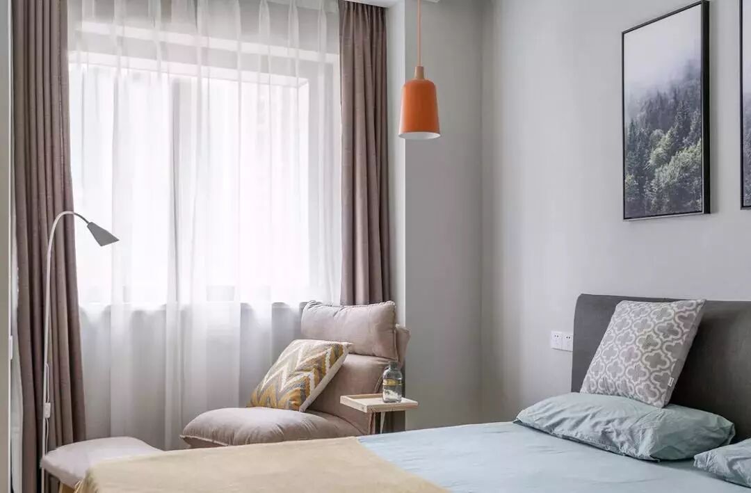 ▲ 柔软舒适的躺椅临窗而立,轻松又惬意,橙色床头吊灯增添活力。