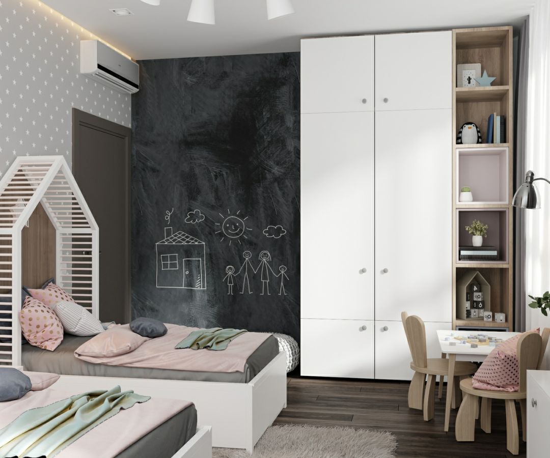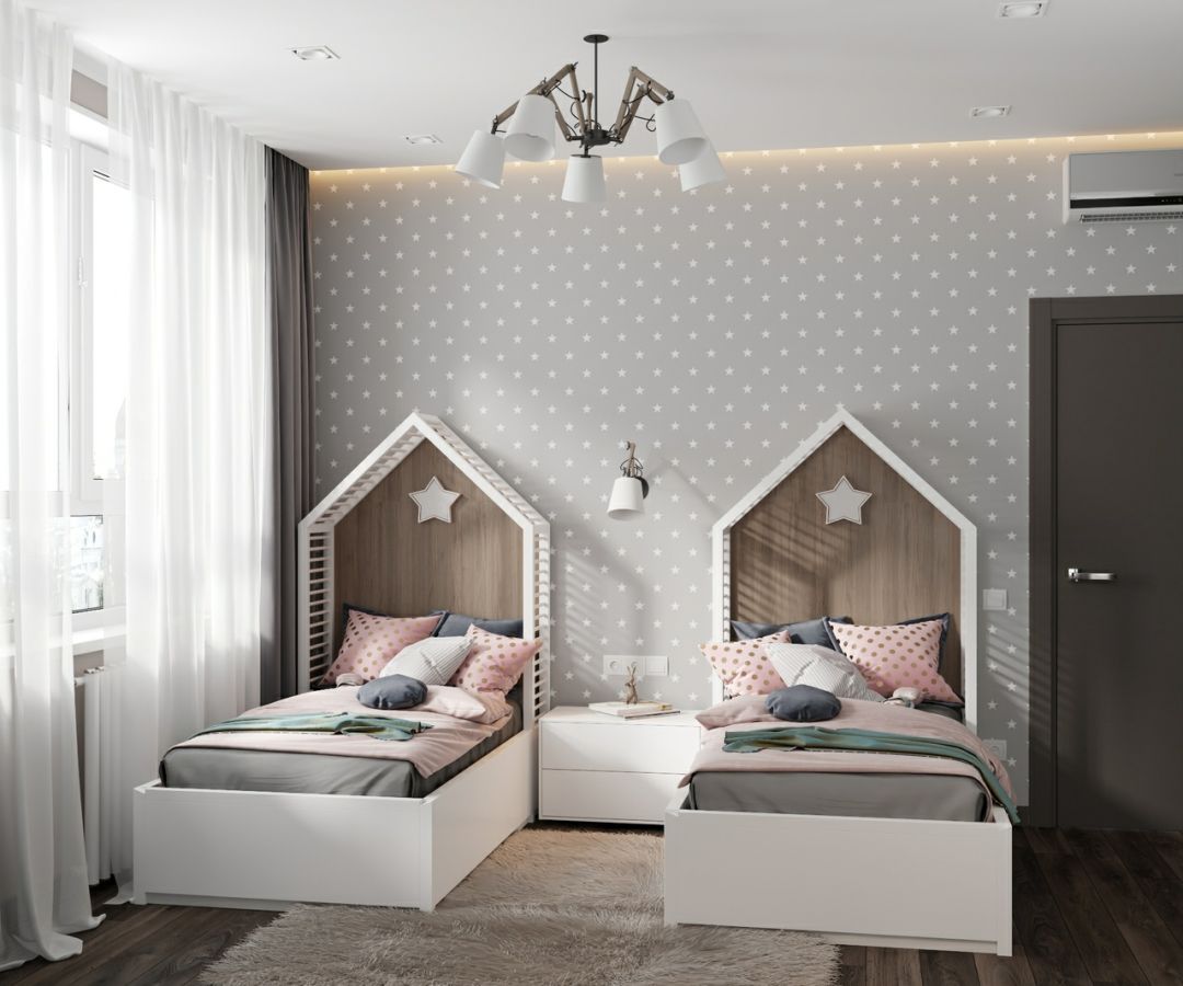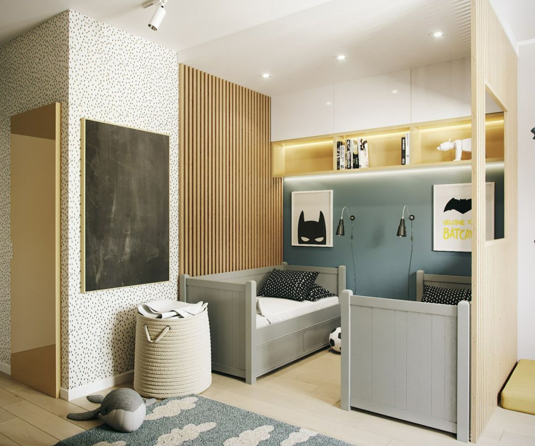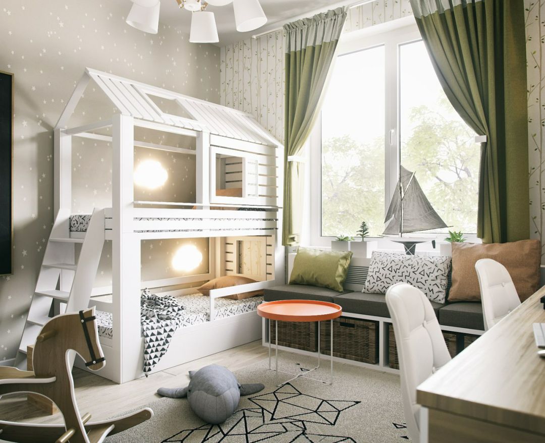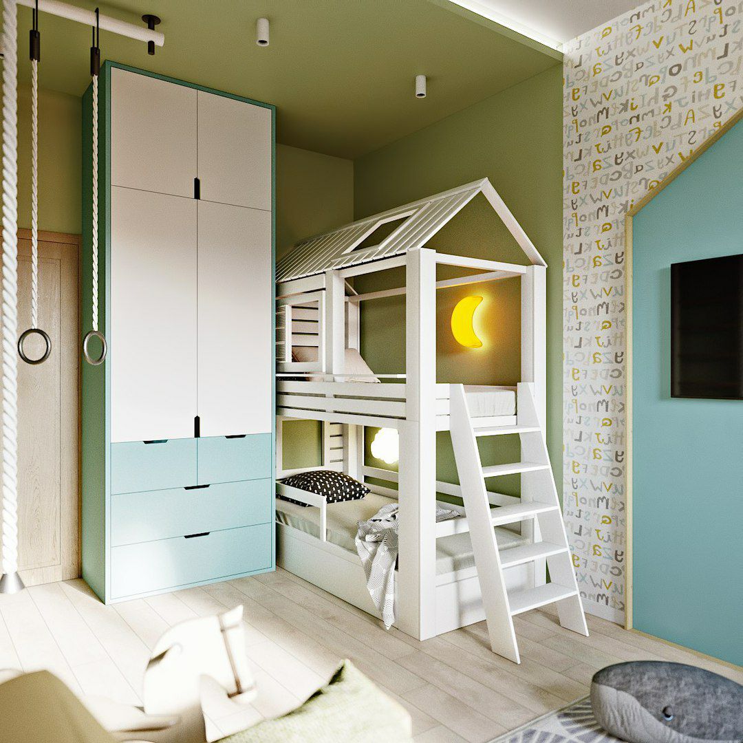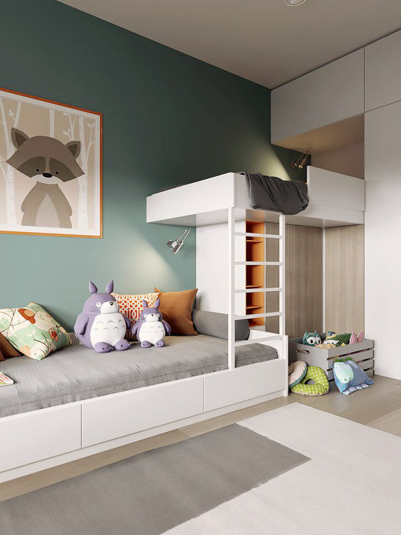 家里有两个孩子的,双人床是很多父母的选择,因为双人床可以节省空间和位置,非常适合两个孩子去共享。两个宝宝住在一起,也方便他们睡前交流,而且即便是睡在下铺的宝宝也不会有压抑感。