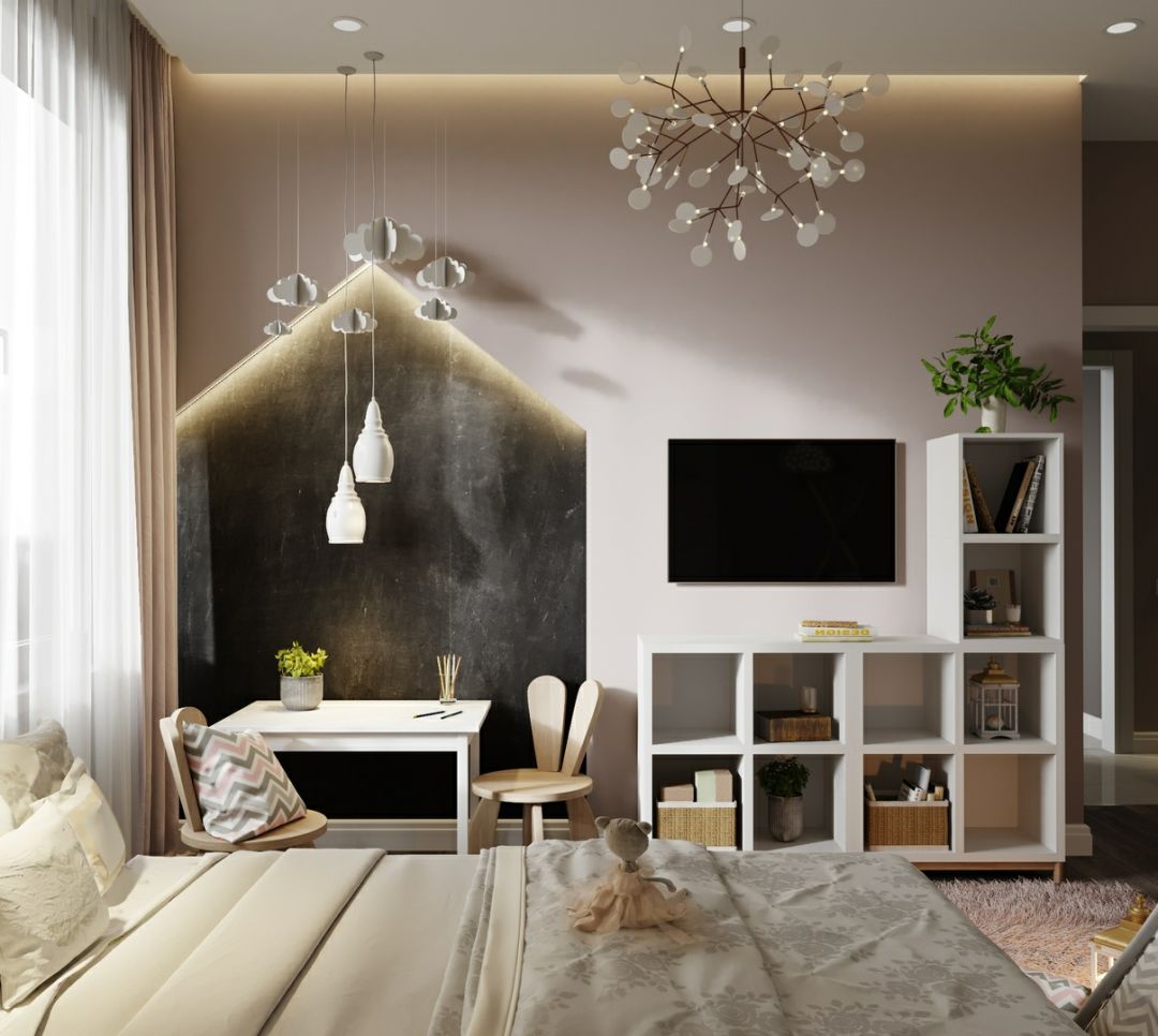 儿童的房间主要就是让孩子都有一个可以休息舒服的地方还有好的学习环境,房间的光线最好是柔和一点,选择暖色的光线,不要让光线直射到孩子的眼睛里面。