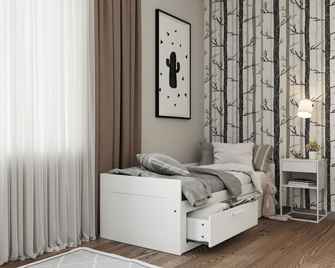 房子面积充足或者家里只有一个孩子的,通常儿童房就摆一张床,整体结构与成人床无异,只是在尺寸和款式上加入了儿童元素,更加符合儿童个性。床边设计学习区和收纳区,空间布局更强调功能性,单人床适合已经上小学的孩子,不仅能够有自己的私人空间而且可以让他们随意折腾。