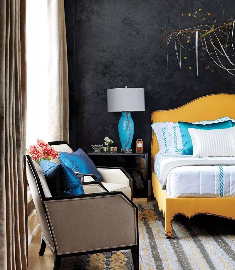 魅影黑主导了卧房的整体色调和氛围,以古金色充作重要点缀并与小面积的浅孔雀蓝形成视觉对比,物与色彩之间互相照应,形成整体感。
