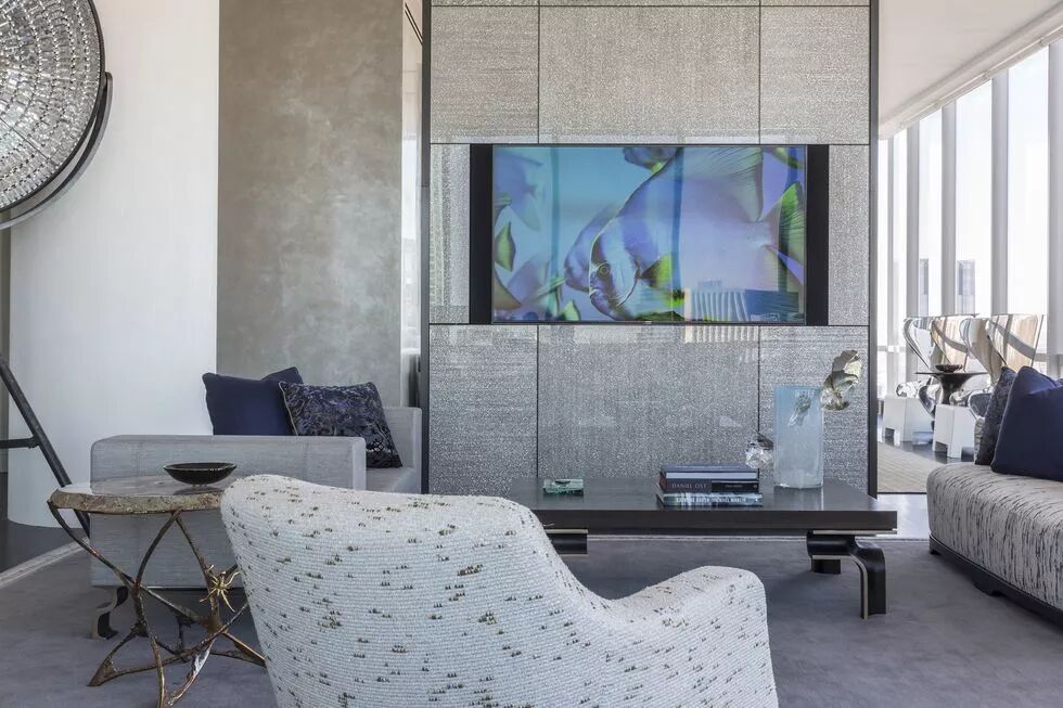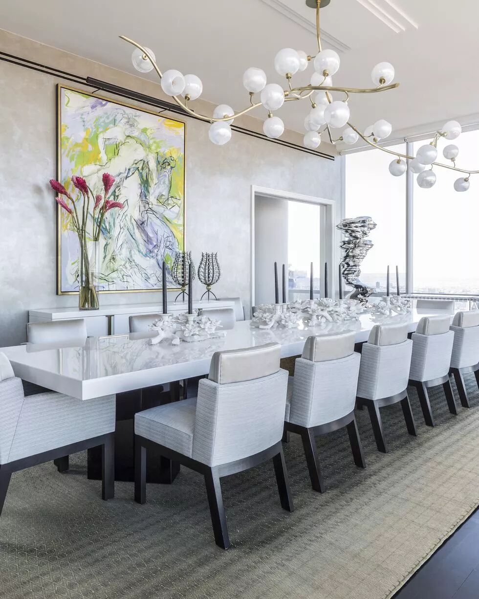 通透的室内环境与窗外的壮丽景色融为一体,建筑带来的紧迫感和压力帮助人们更好地消化整体设计。高级灰与金色调共同联结华丽轻奢的调性,水晶灯和一系列折射着耀眼光芒的玻璃制品宛若施华洛世奇般闪耀。