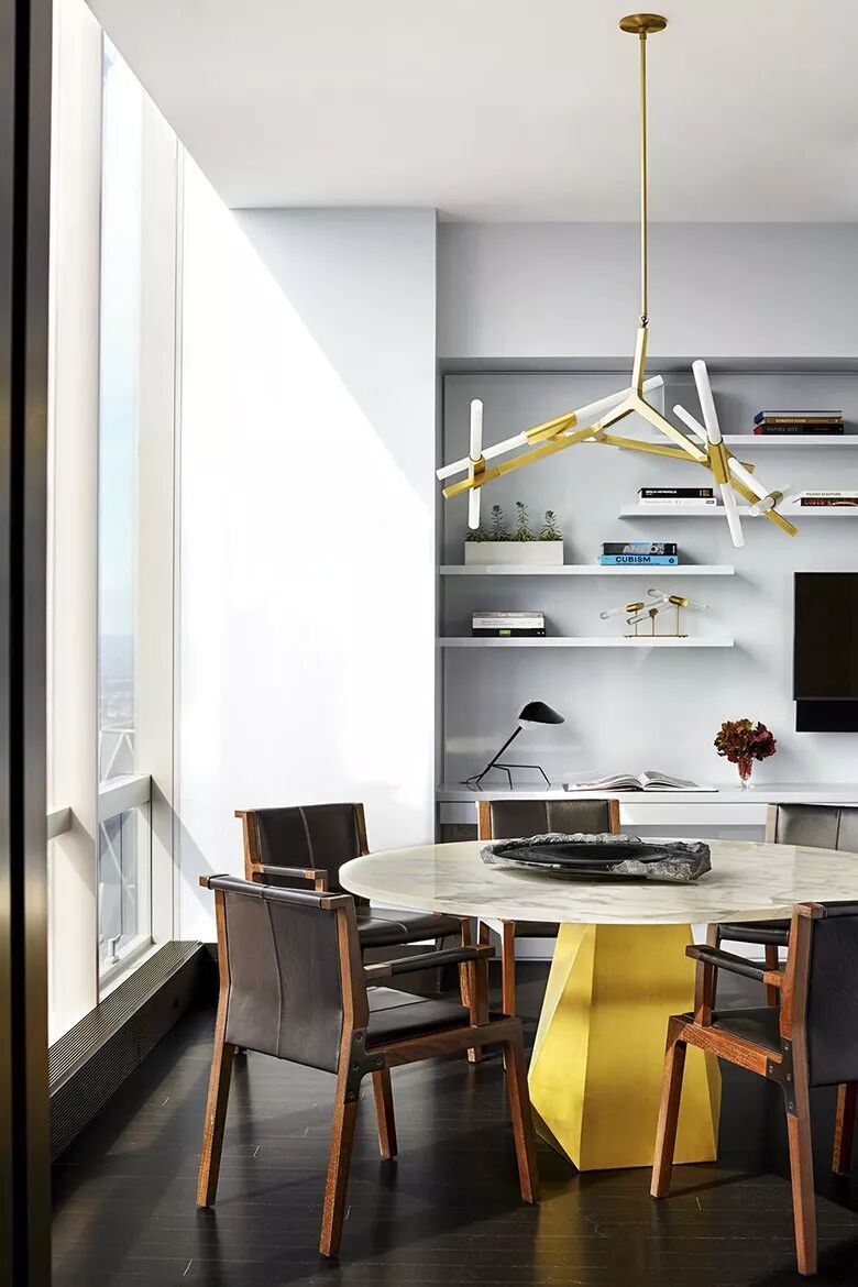 餐厅使用整块吊灯,降低层高,明亮的内嵌式射灯补足光线,让区域之间紧密联系形成整体感。降低的层高给人温馨的用餐环境,安全感和密封性,便于人们交谈欲望的提升。