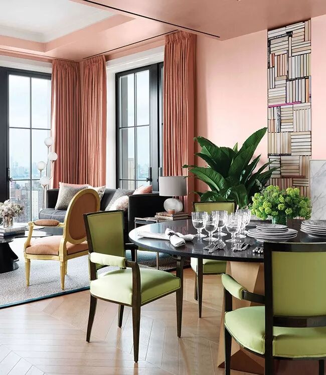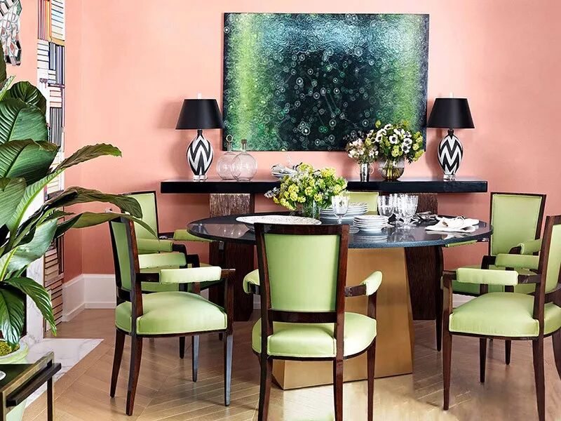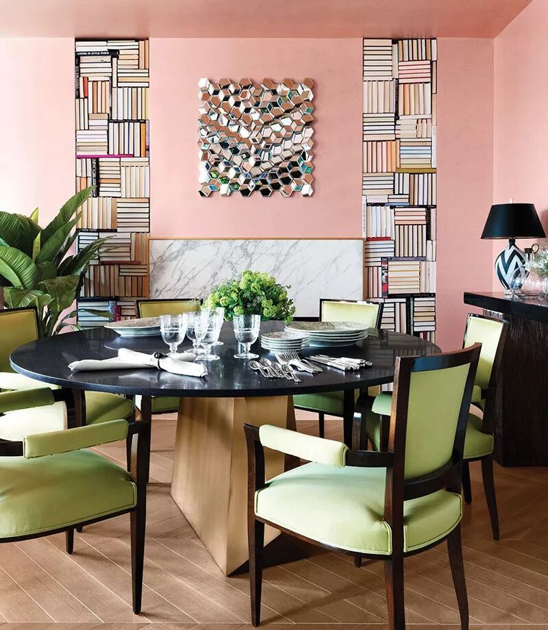 绿光色的复古餐椅与装饰挂画遥相呼应,与空间的主色强烈互补,用色的绚丽饱满让人食欲大增。亮点在于餐厅区域的主墙壁,直线造型的壁龛设计拉伸空间,而填满的书籍充分地显示出其实用价值和装饰性。