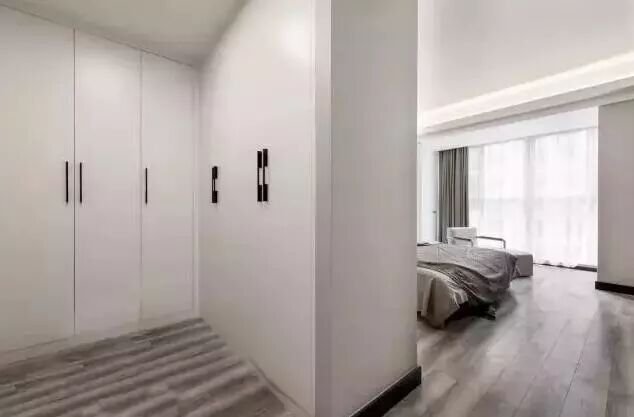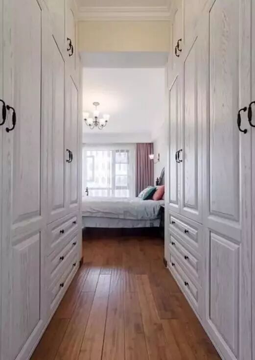 如果进门过道两侧够宽,我们可以尝试着在两侧做成衣帽间,虽然进门两侧不会显得很宽舒,但好在我们只是经过两侧,而且又多了那么多的收纳衣柜,也是很值了。更重要的是一进卧室就感受到满满的整洁舒适。