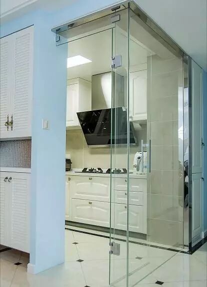 玄关后就是简洁的厨房,考虑基本做中式饭菜,透明玻璃拉门的加入使得整个空间通透了起来又能阻挡油烟