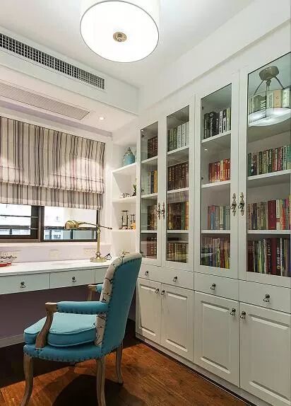 书房设计整墙书柜,白色柜子古铜色把手和台灯,配上深色地板,蓝色沙发点缀