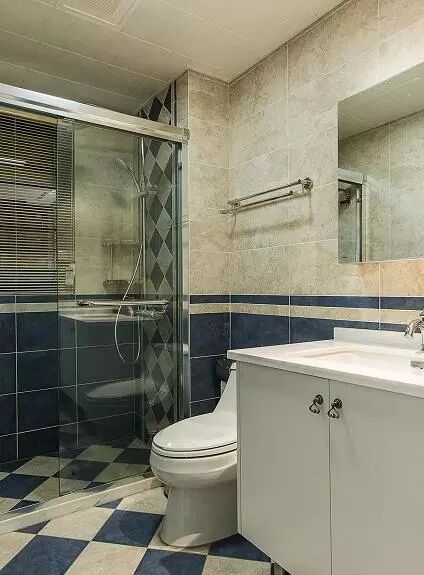 卫生间采用两种色调瓷砖拼贴出美式复古格调,玻璃淋浴房让空间做到干湿分区