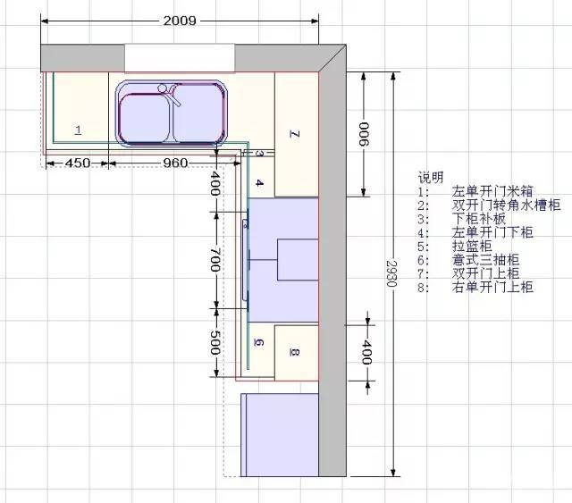 3、在靠近门的地方要预留一定的空间,如果将橱柜尺寸设计的和厨房空间大小完全贴合,那么就会在橱柜安装以后影响厨房门的使用。