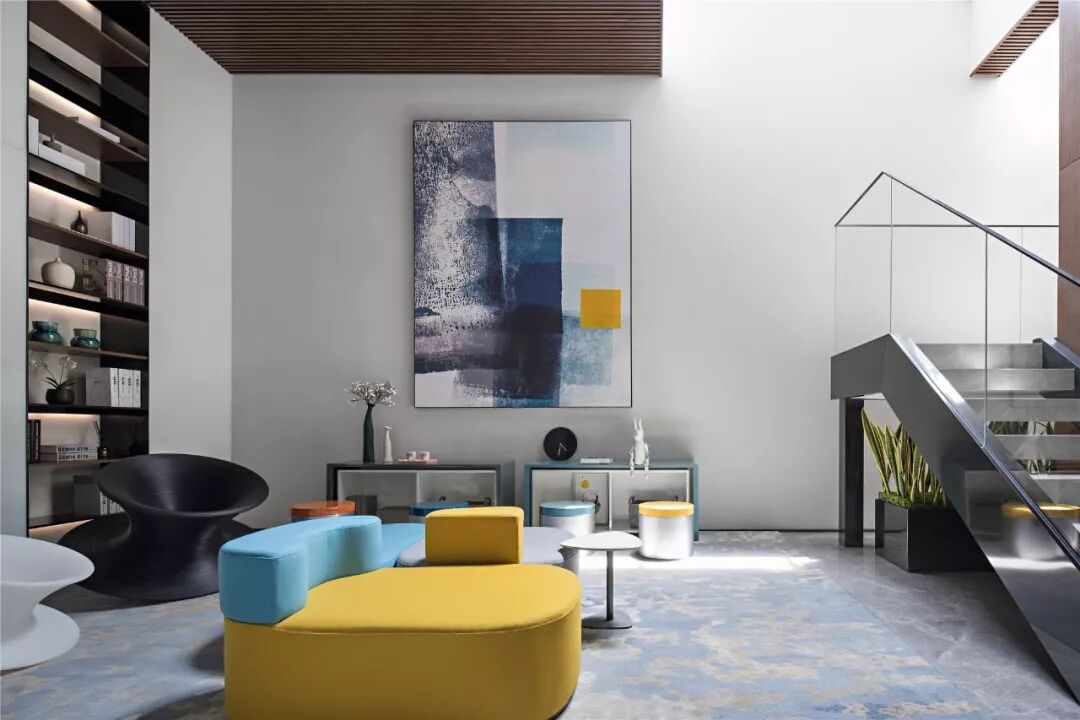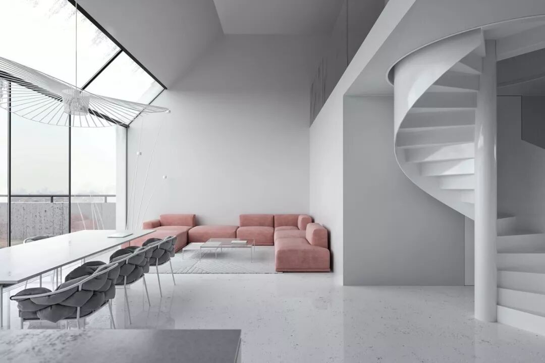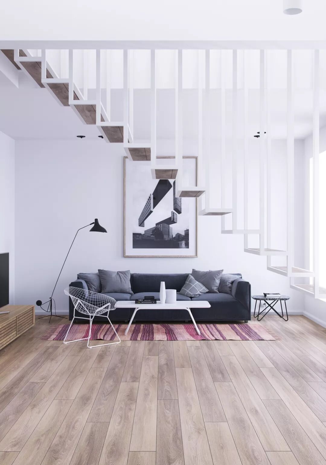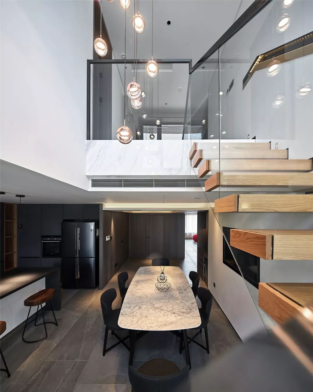 悬浮式楼梯轻巧优雅,可以将空间的错落感诠释到极致,充满线条感的衔接让空间更具艺术气息。