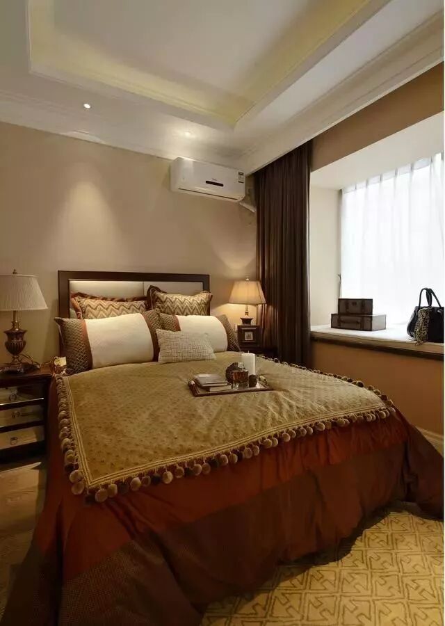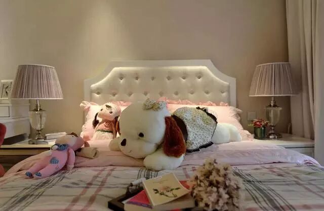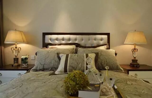 次卧淡黄色背景墙,床头两侧台灯设计,避免了小空间的压迫感。