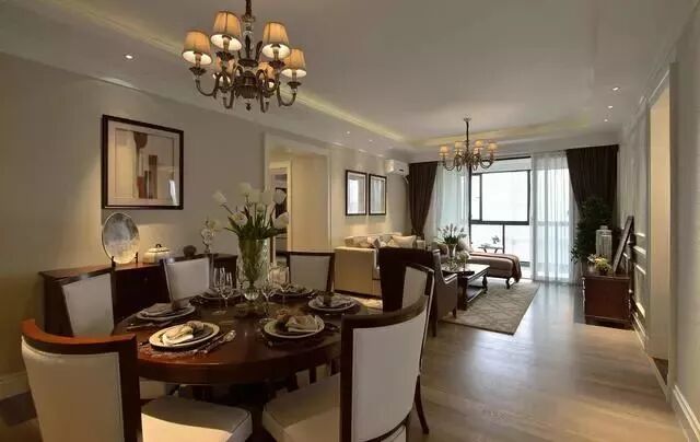 餐厅以白色做背景空间,黄铜色的吊灯与餐具交相辉映,简单而又清新。