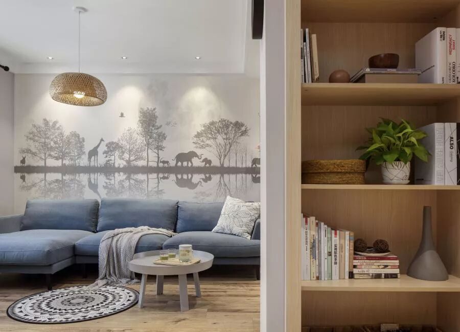 齐家小菜很喜欢沙发背景墙的设计,朦胧的森林公园画,在树与动物之上,布置上三盏射灯,就像是太阳照射在迷雾满布的森林上。
