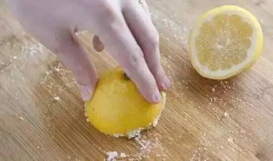 用半颗柠檬按压盐粒不停摩擦砧板,直到全部擦拭一遍,再用清水冲洗干净即可。