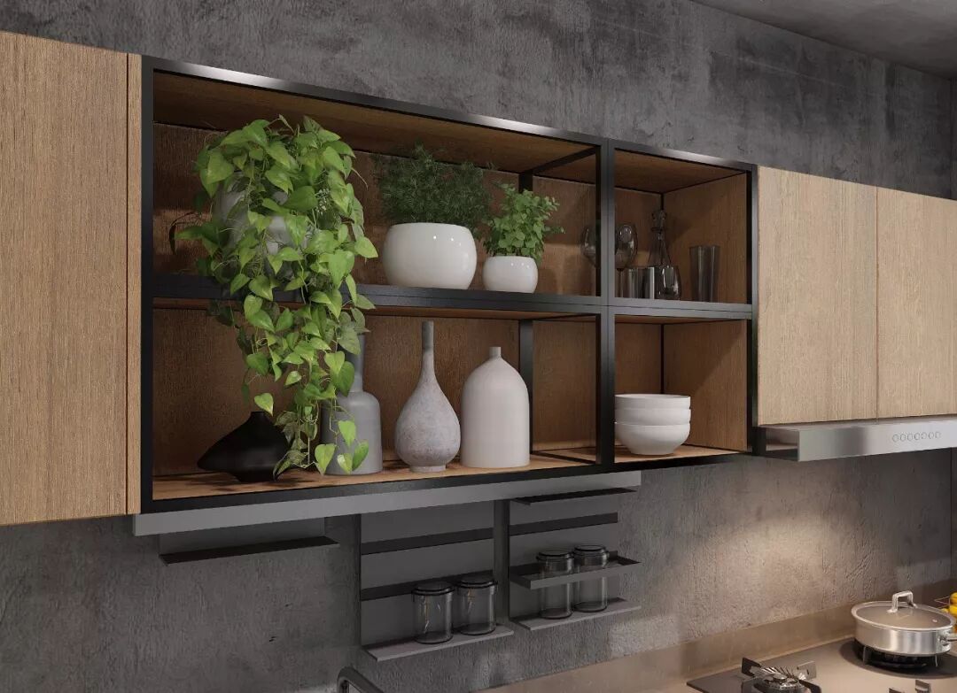 铁艺与触感木纹纹路的3D压纹板构成吊柜部分,开放柜处的粗犷铁艺设计,更为厨房增添冷峻风格,更具艺术特性。墙面开放功能柜,空间设计多层次,明确功能区划分,强化收纳功能。