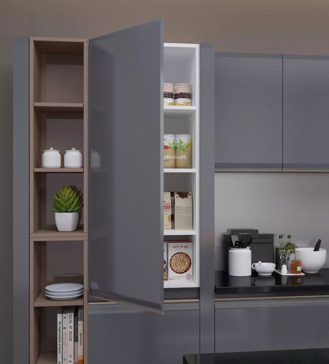 马赛不仅颜值高,更有强大收纳功能。地柜下方配置锅具收纳能手,再多的锅碗瓢盆都能变成小菜一碟,被收纳的明明白白!高柜处设计为开放式储物柜,有更多的展示功能。