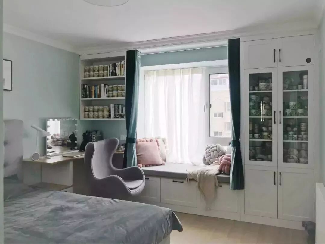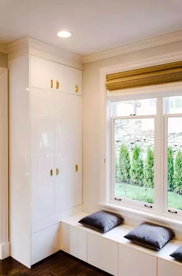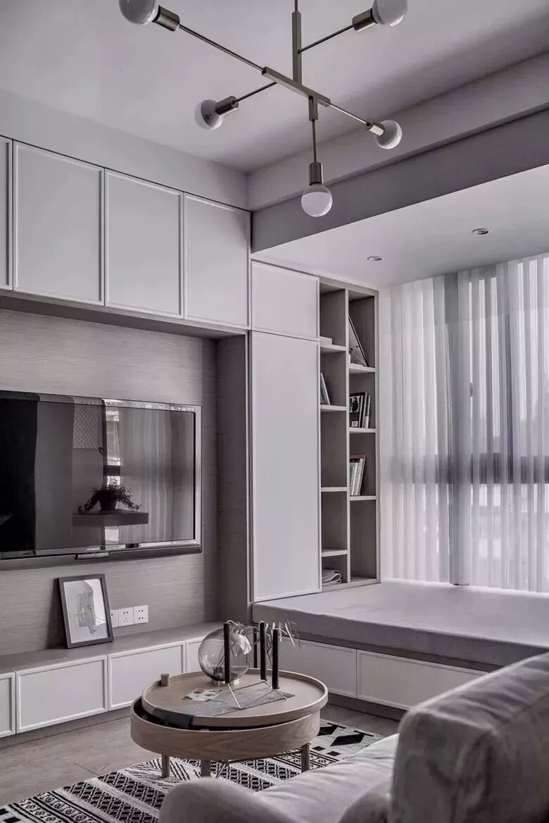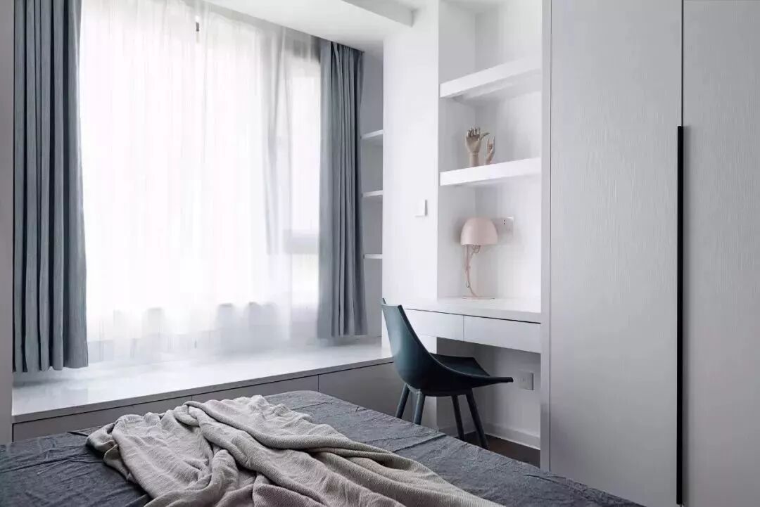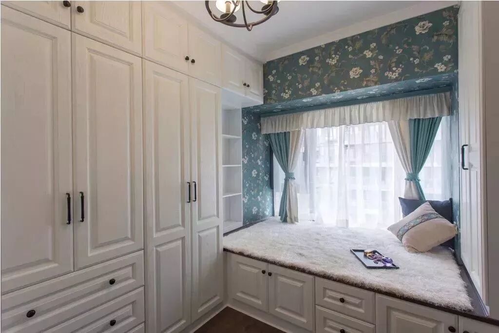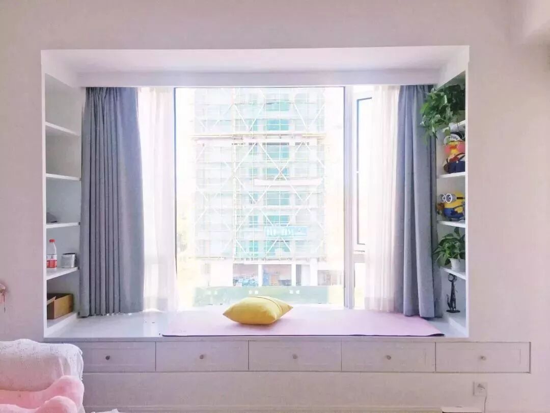 对于面积较小的房子,利用好每一片面积是小户型设计的秘籍,比如说窗户两侧的墙面空间,往往都是被留空闲置,这对于小户型来说未免显得太可惜了,其实只要在这个基础加一个飘窗,并在两侧空间做柜子的,这种隐藏式的收纳方式,既能保持整洁的视觉效果,而且也是非常的别致有趣!