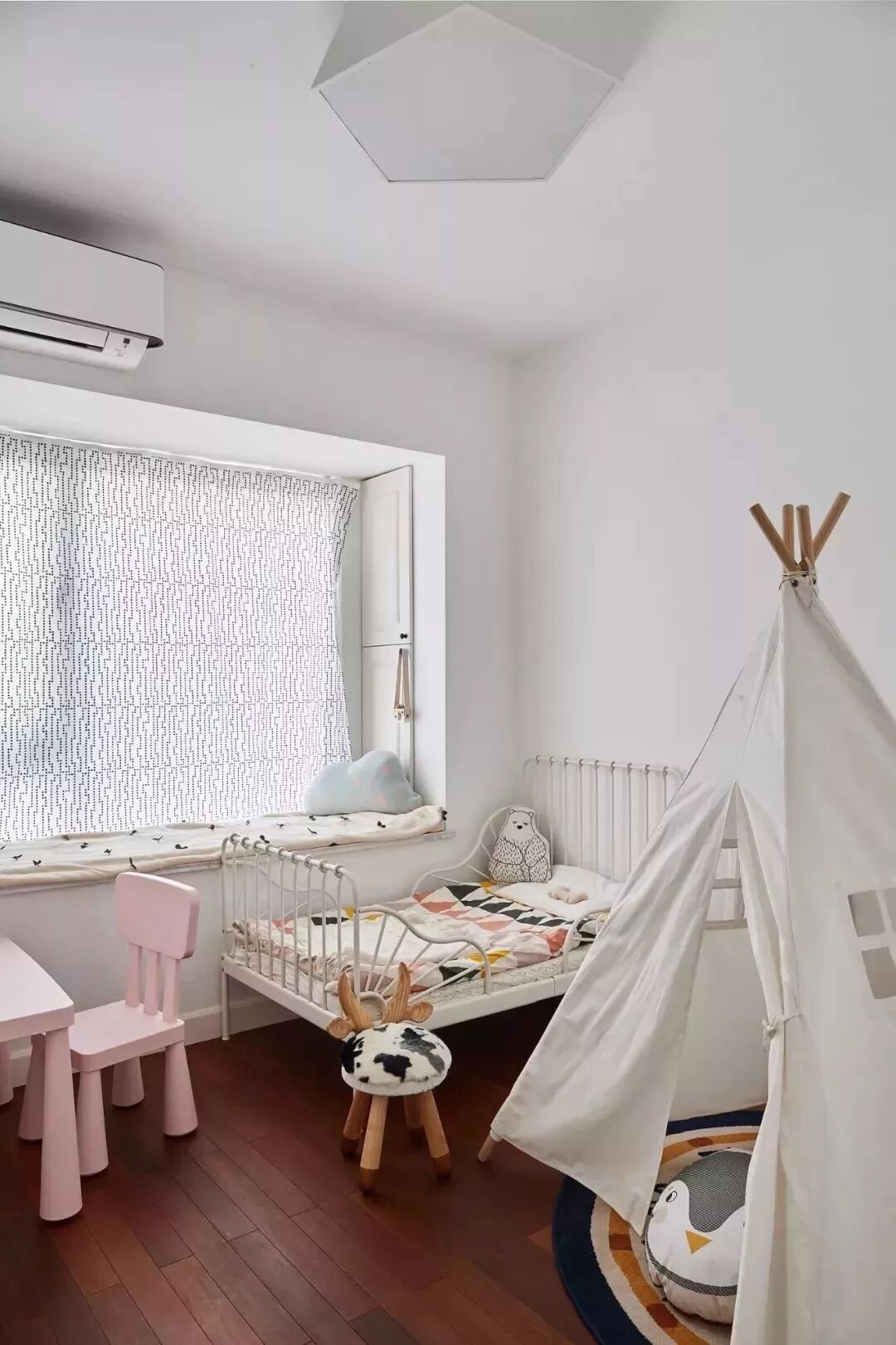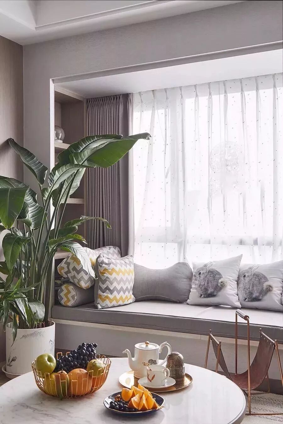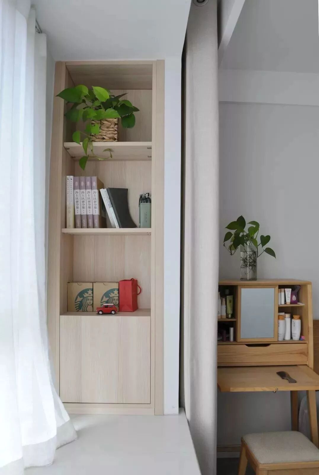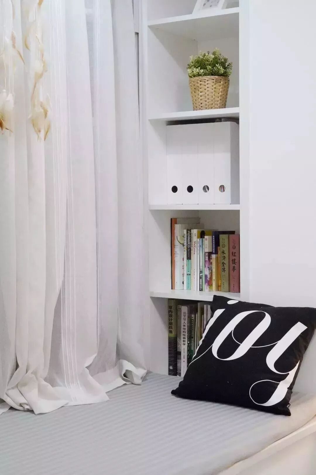 对于面积较小的房子,利用好每一片面积是小户型设计的秘籍,比如说窗户两侧的墙面空间,往往都是被留空闲置,这对于小户型来说未免显得太可惜了,其实只要在这个基础加一个飘窗,并在两侧空间做柜子的,这种隐藏式的收纳方式,既能保持整洁的视觉效果,而且也是非常的别致有趣!