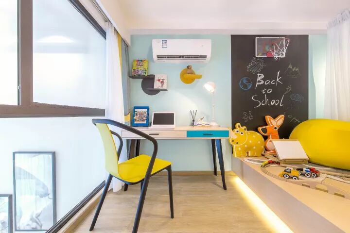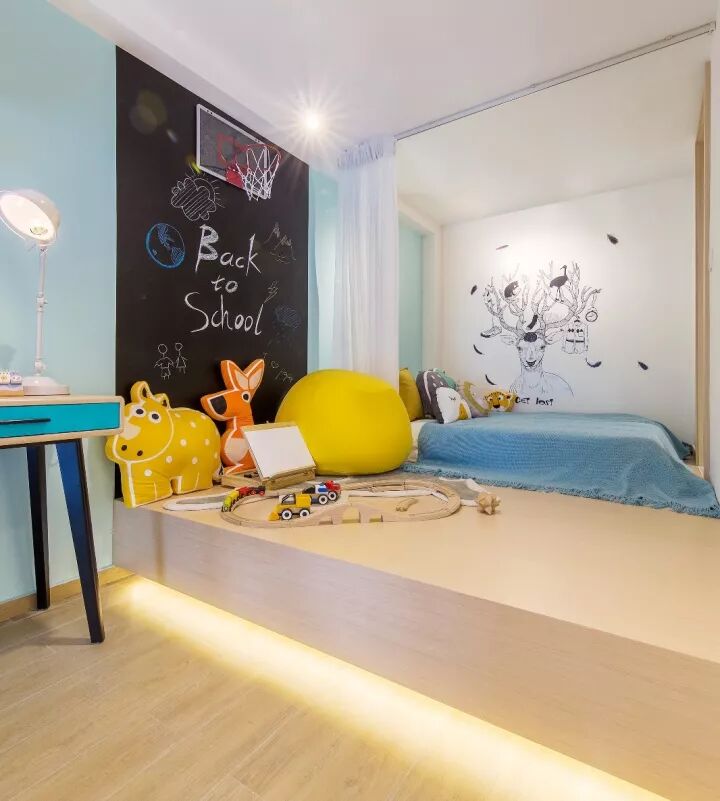 黑板墙、榻榻米、简易的书桌、篮球框、个性的玩偶,简直来到了一个童话般的世界。
