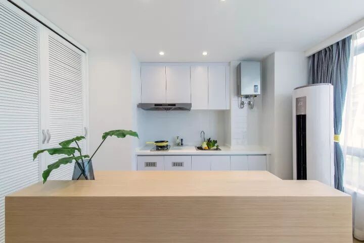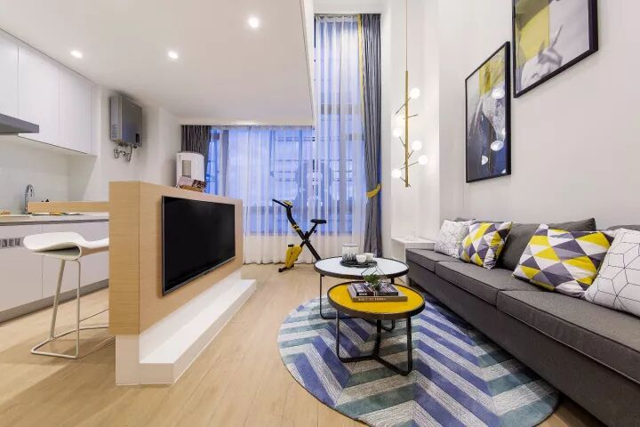 开放式的客厅还兼容了健身区域、厨房、餐厅。每一个角度都是精心设计,毫不浪费一丁点空间。