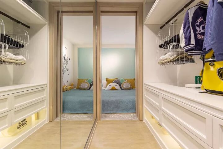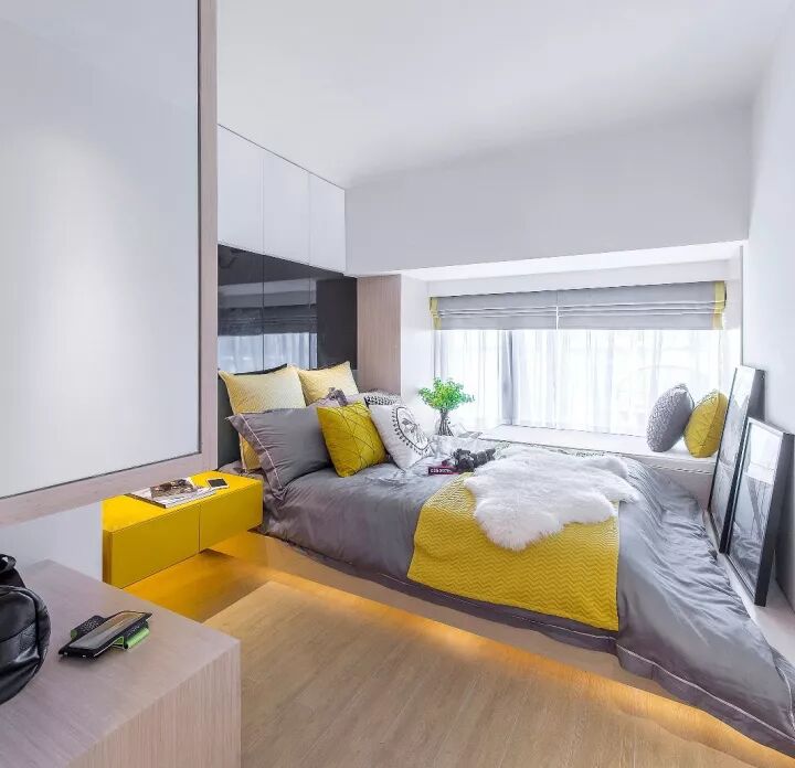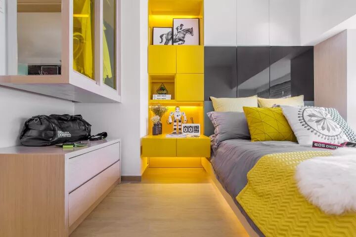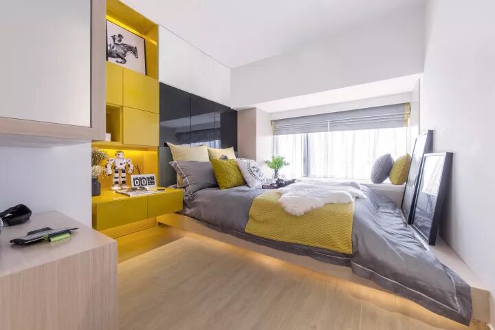 传统的床头柜是绝对不会出现在这个家中,重新规划的床头柜和壁柜相结合与靠着墙面的床,改变了整个空间结构,让房间趣味性十足。