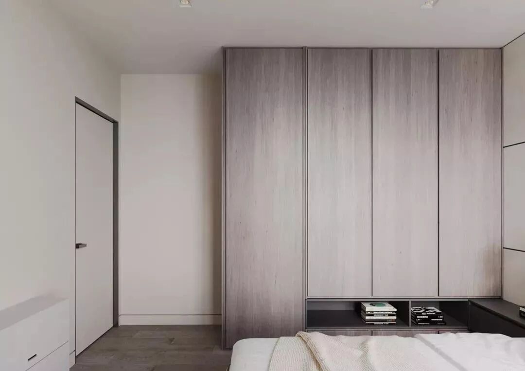 从床头隔板延伸到衣柜处的收纳