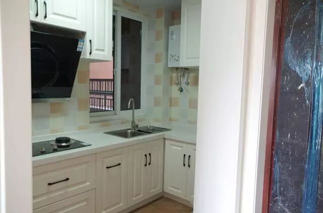 进门的右手边就是厨房,能打柜子的地方打得很满,就连油烟机上方也打了吊柜,虽然用处不是很大,但是也能放置一些小的厨房工具等。