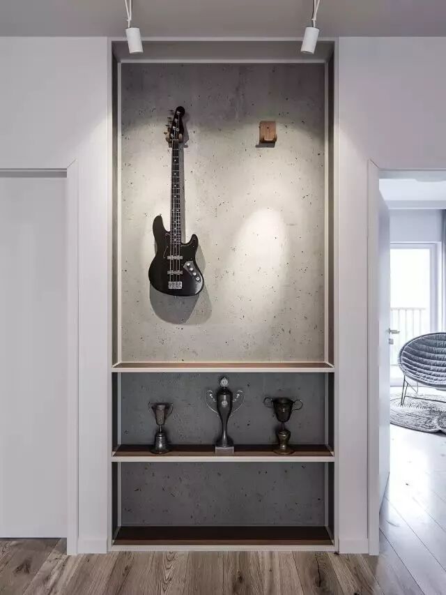 ▲ 这个家庭并不是将某些乐器隐藏起来,而是采用了一种醒目的方式和低调的混凝土背景完美配合。