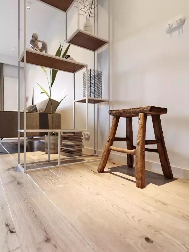 ▲宽敞的装饰架有助于将起居室与入口处分开,在这里,一个可爱的乡村凳子等待着居住者脱下鞋子。