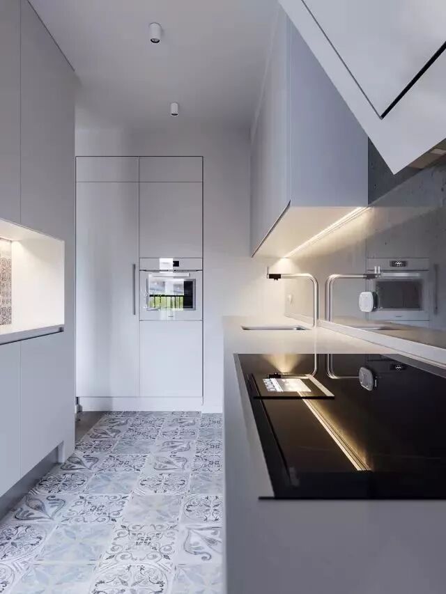 ▲ 在厨房里,简约干净风格和独特的图案相互冲突。中间墙的设计成就了客厅的独特美学。