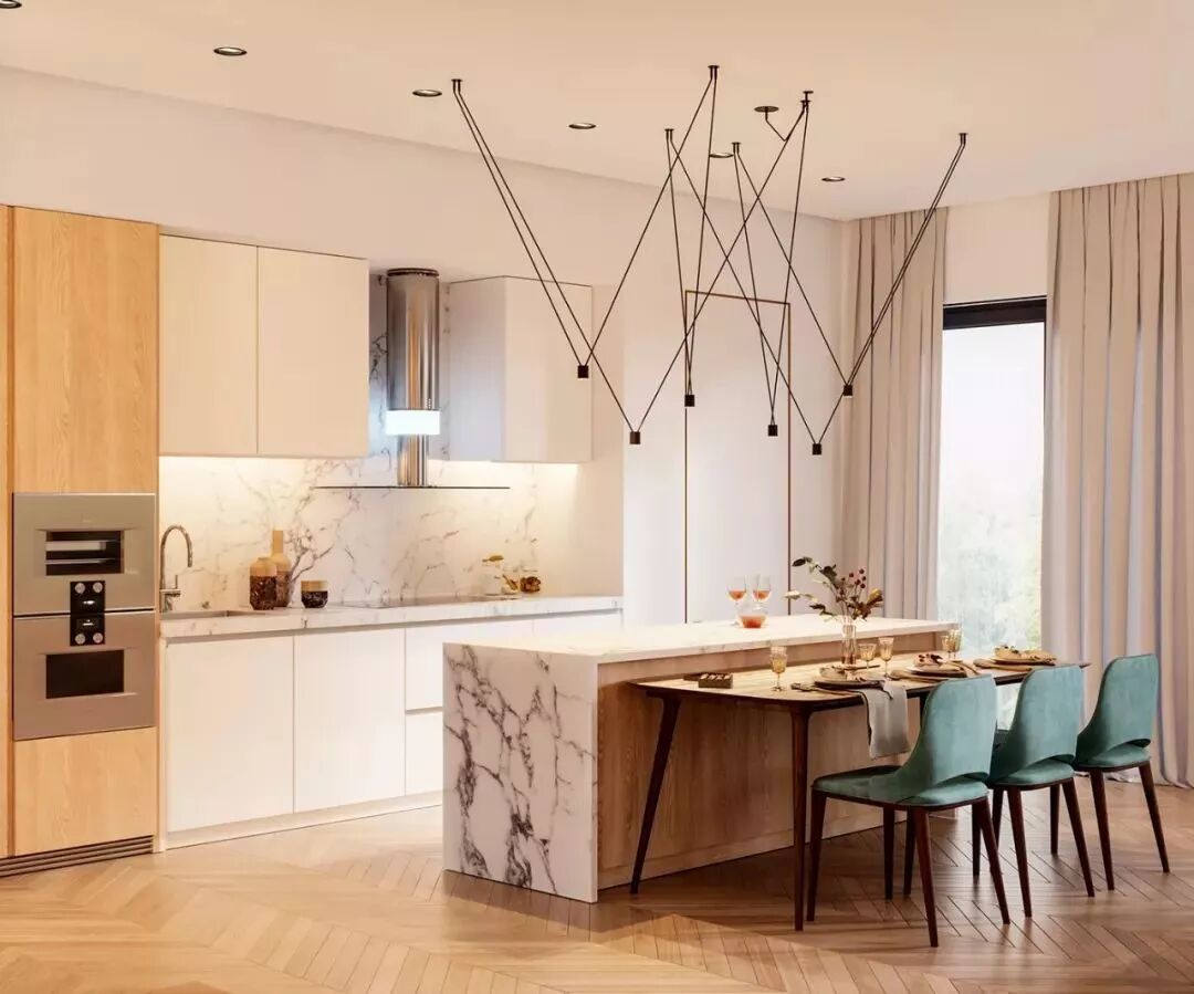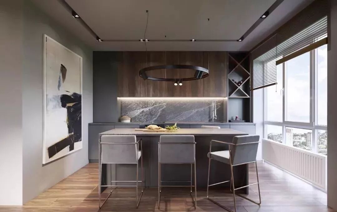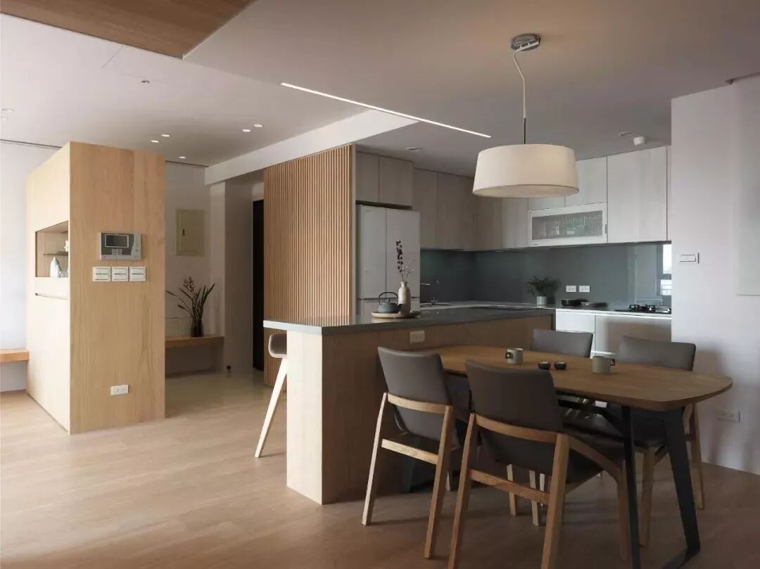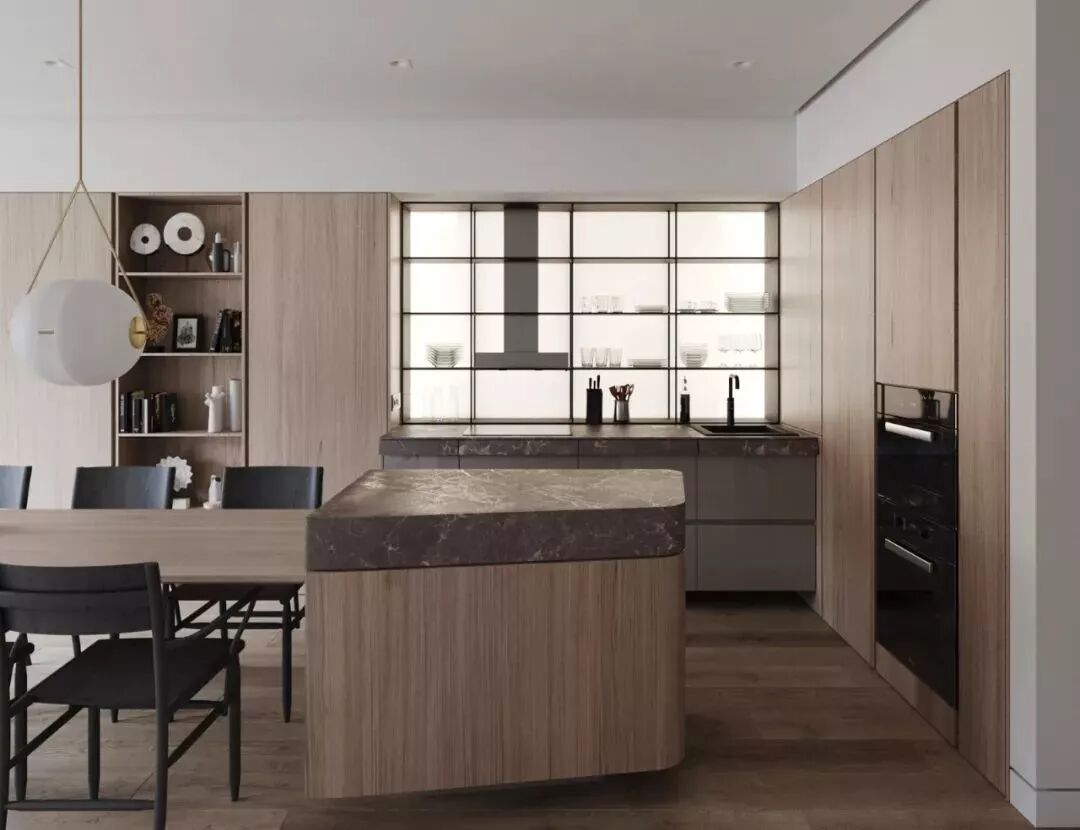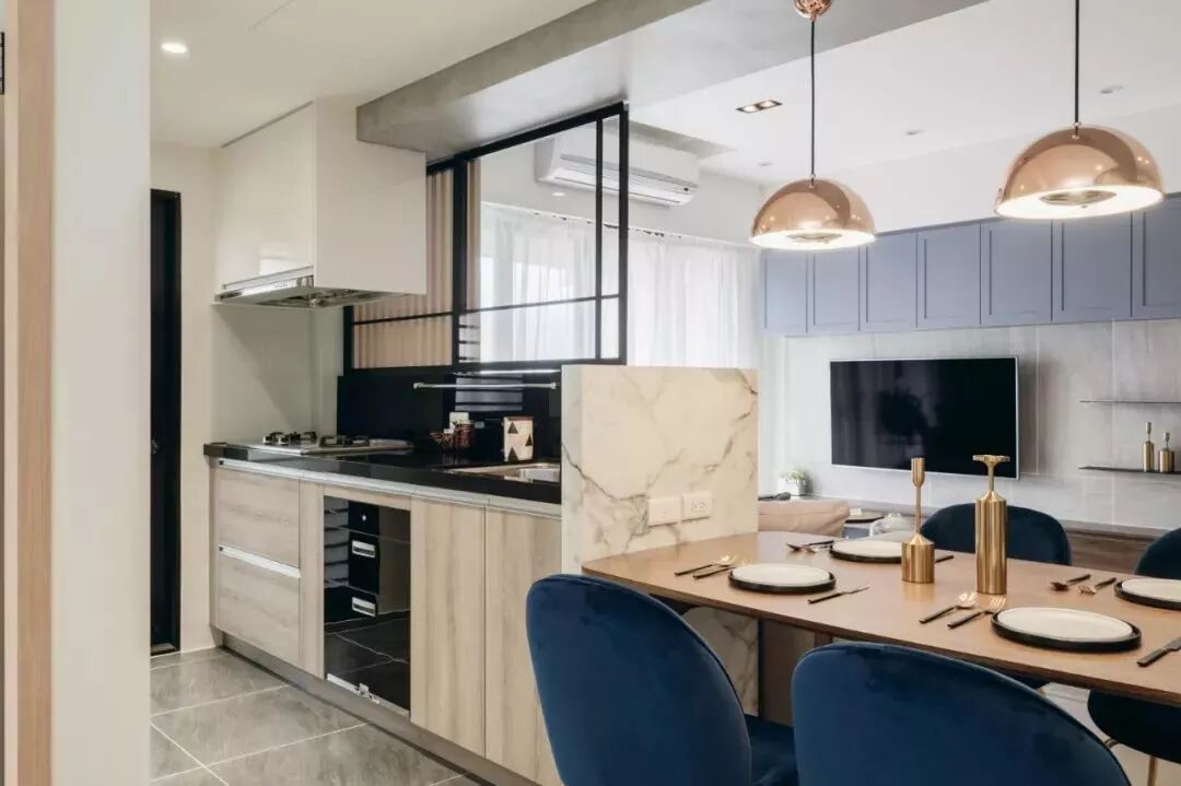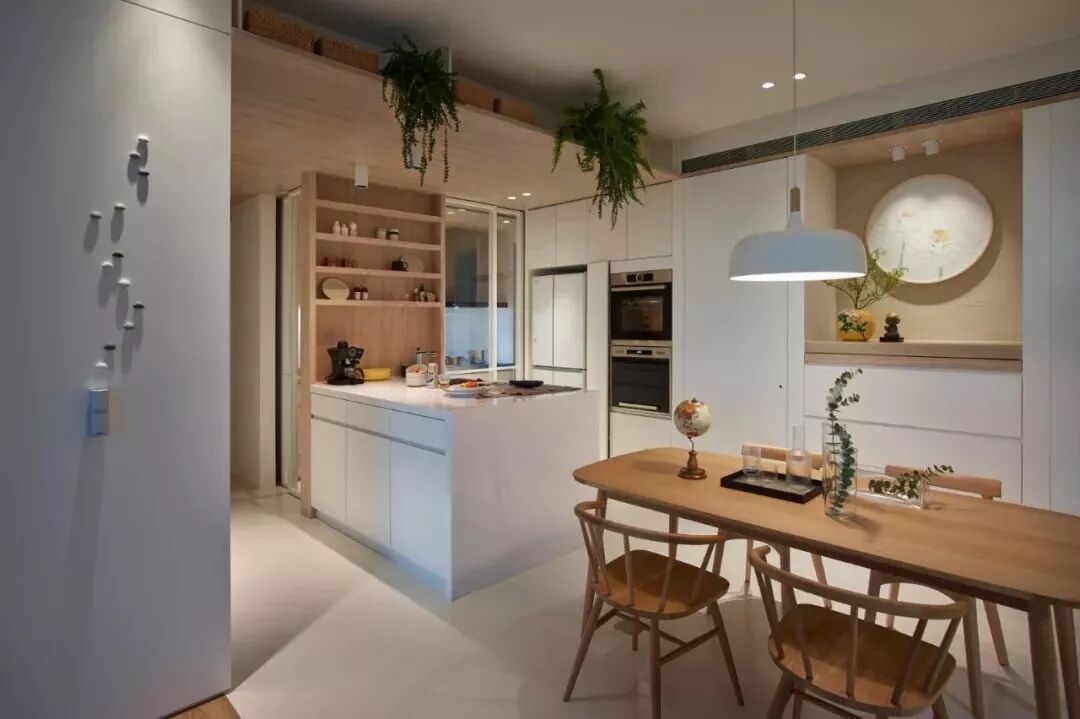 开放式的厨房基础,装一个中岛台隔出厨房与餐厅区域,这样可以增加餐厨互动,老公炒菜、老婆在中岛台准备料理,让家人共同参与烹饪的乐趣,比较适合面积较大的户型。