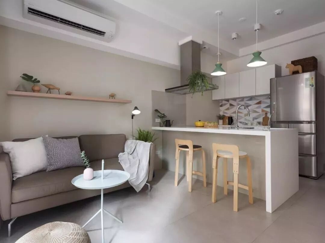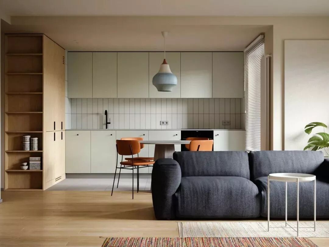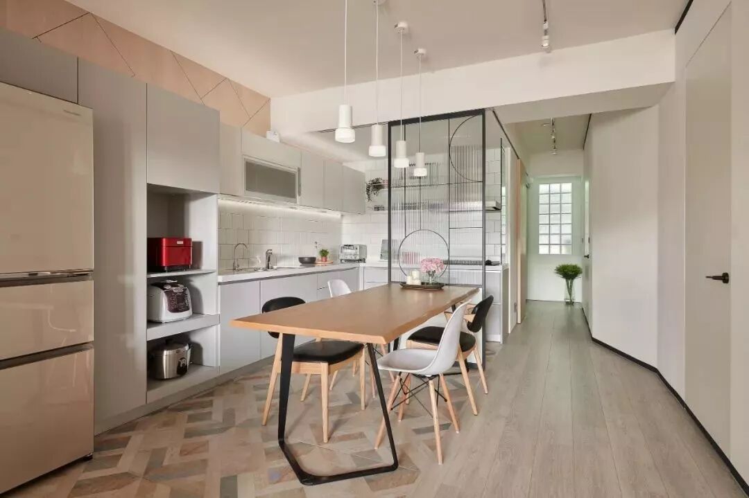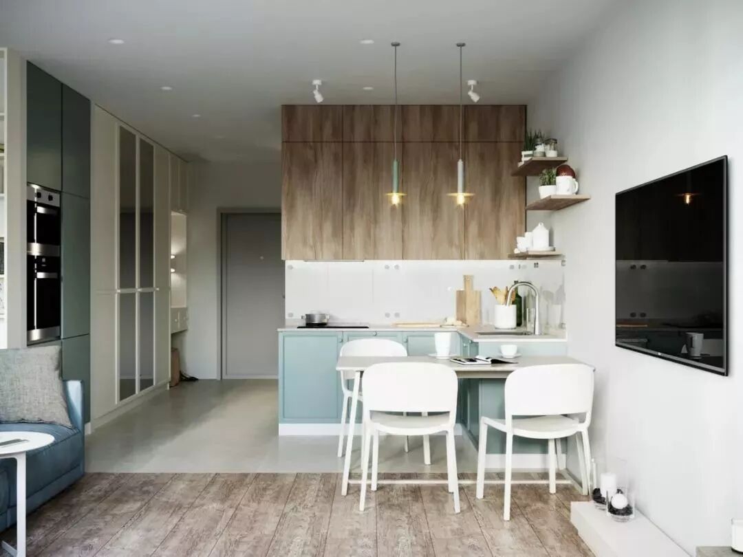 整个厨房就可以开放式的形式展示在空间内,或是过道、或是小厨房,总体来说这种开放式厨房的设计,往往更适合面积较小的刚需小房子,可以在不占用太多空间的基础实现厨房功能。