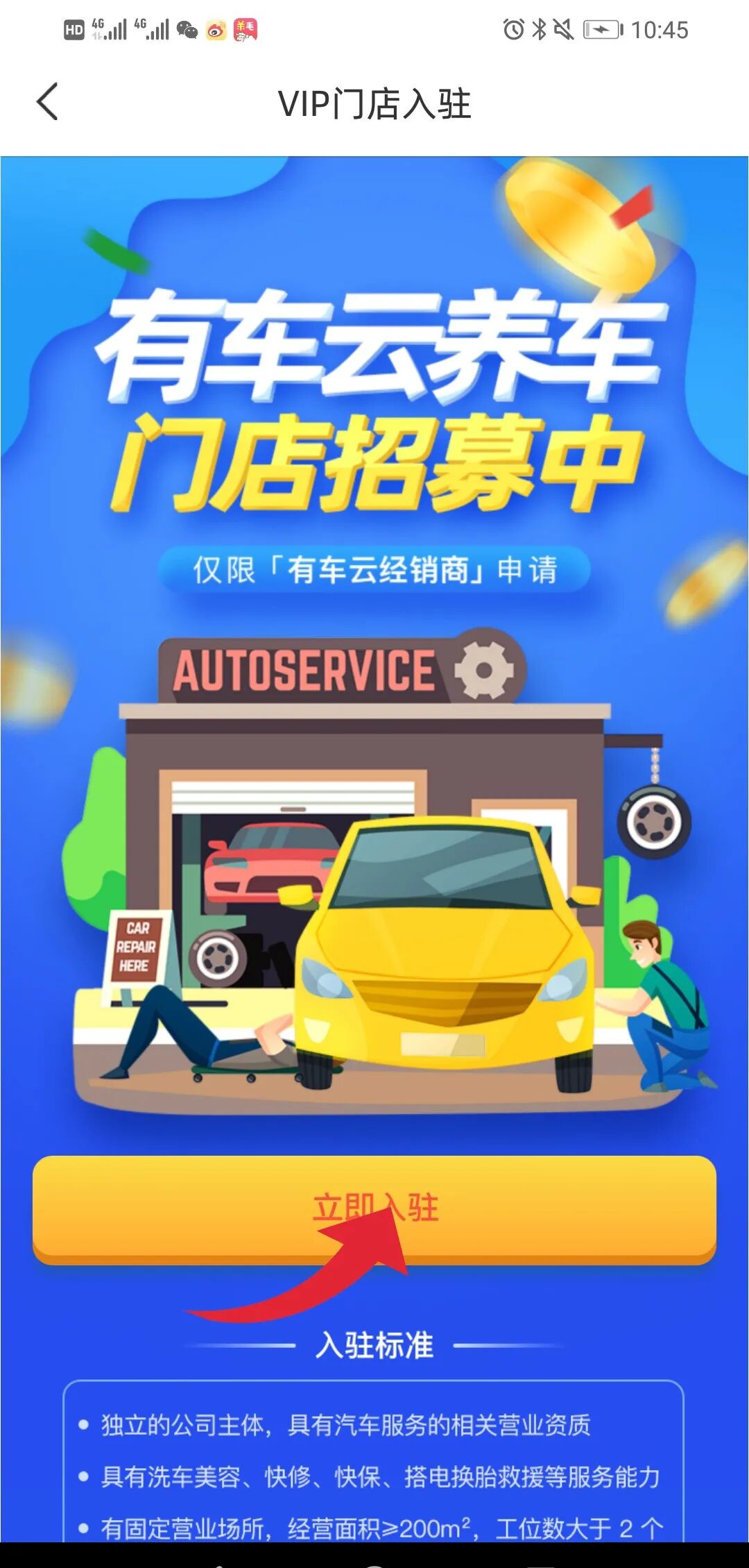 身份注册成功之后,您就获得了分享车云卡、门店入驻权等等多项特权,就可以上传您的门店了。如图所示,在“有车云”APP中点击-我的界面中点击-门店招募, 点击立即入驻。