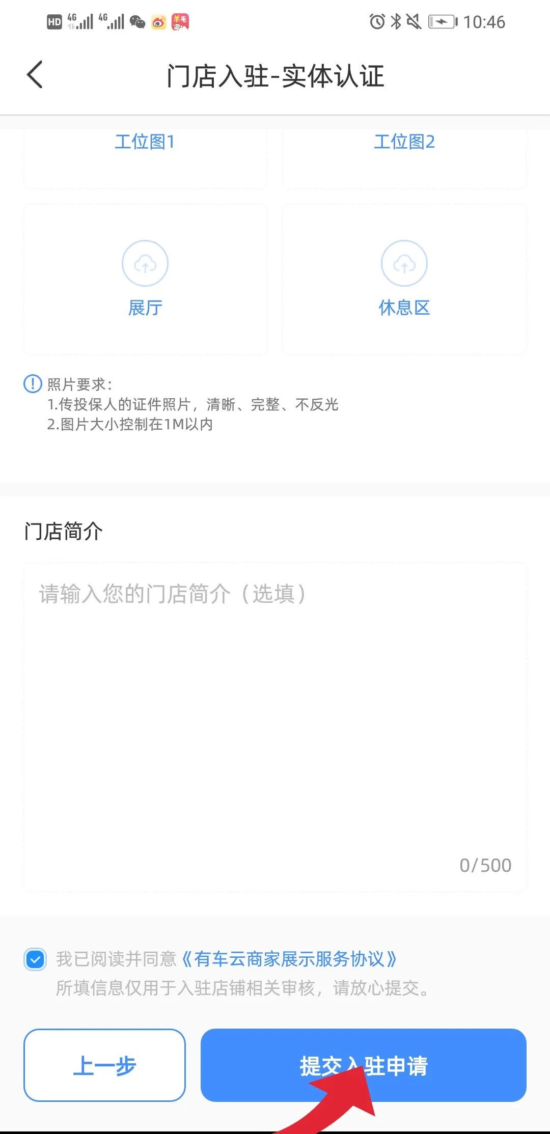 填写门店基础信息,包含:门店名称、地址、电话、定位、选择门店类型,还有经营品类的一些信息,门店基础信息填写完成后,点击下一步;再上传入驻门店认证信息,包含:营业执照、营业主体信息、店铺照(工位、门头、展厅...)、门店简介等等,输入完成后点击提交入驻申请即可。